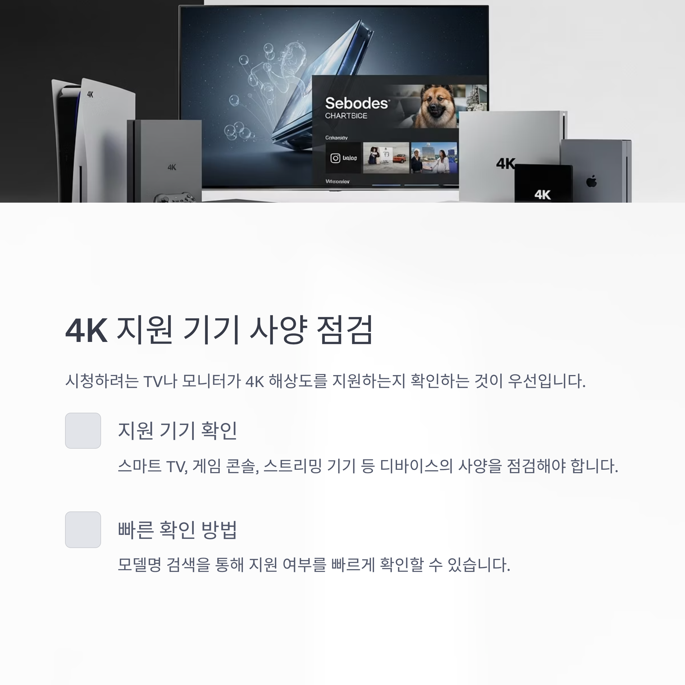 시청하려는 TV나 모니터가 4K 해상도를 지원하는지 확인하는 것이 우선입니다.