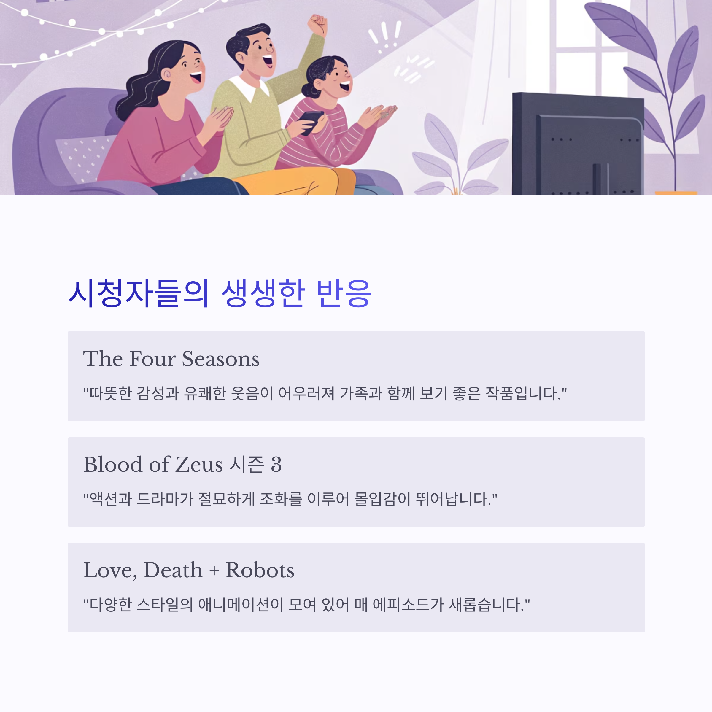 - 시리즈의 연속성: 'Blood of Zeus'와 'Big Mouth'는 각각 시즌 3과 시즌 8로, 기존 팬들의 기대를 충족시키며 새로운 시청자도 유입합니다.