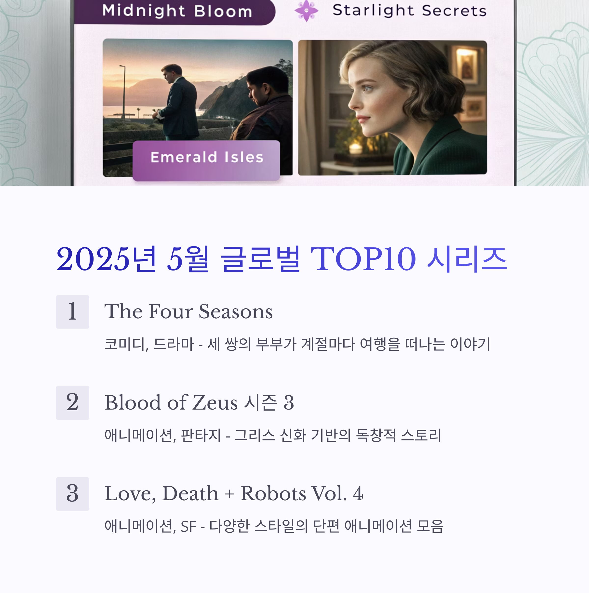 | 3 | Love, Death + Robots Vol. 4 | 애니메이션, SF | 다양한 스타일의 단편 애니메이션 모음 |