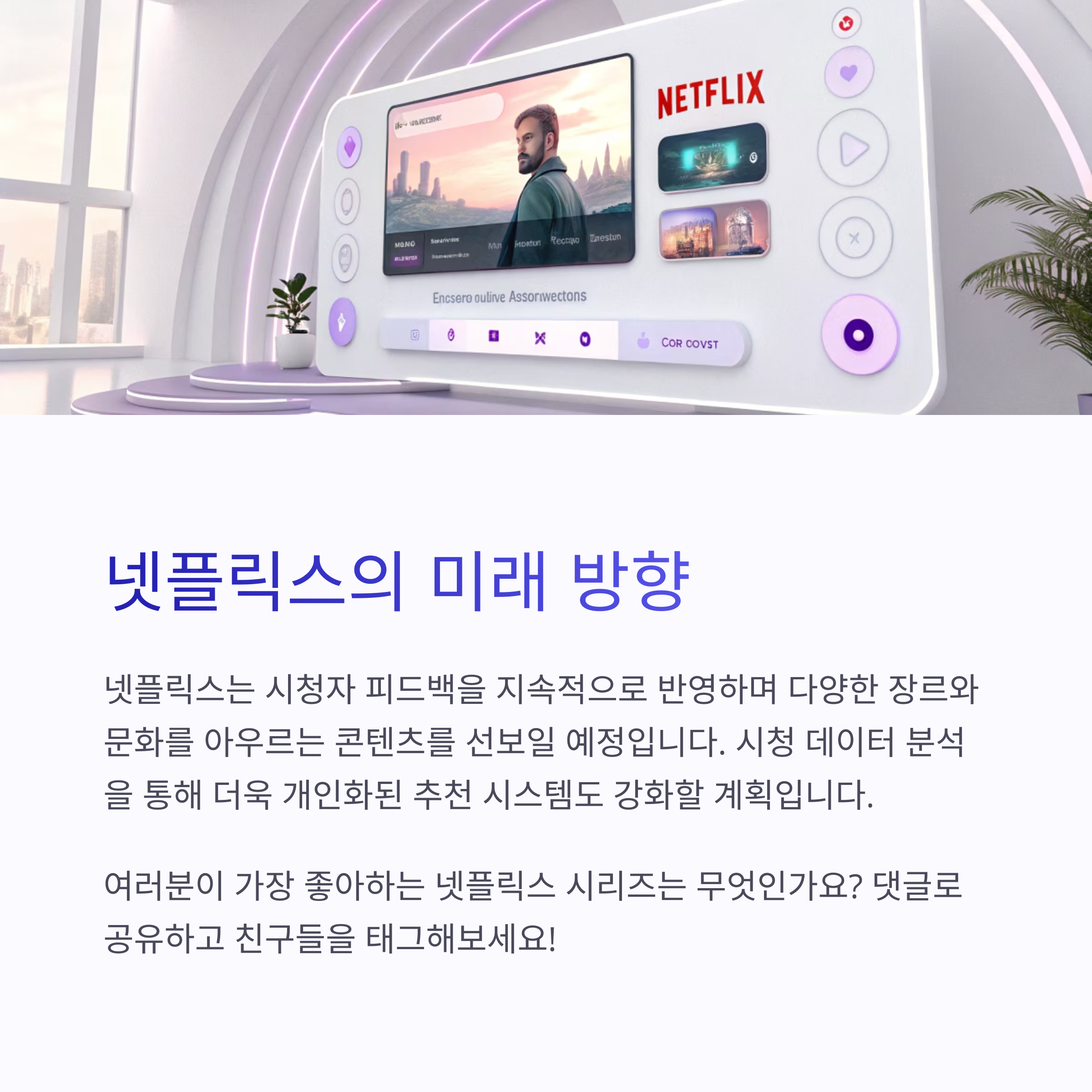 넷플릭스는 지속적으로 시청자들의 피드백을 반영하여 콘텐츠를 개선하고, 다양한 장르와 문화를 아우르는 작품들을 선보일 예정입니다. 또한, 시청 데이터 분석을 통해 더욱 개인화된 추천 시스템을 강화할 계획입니다.