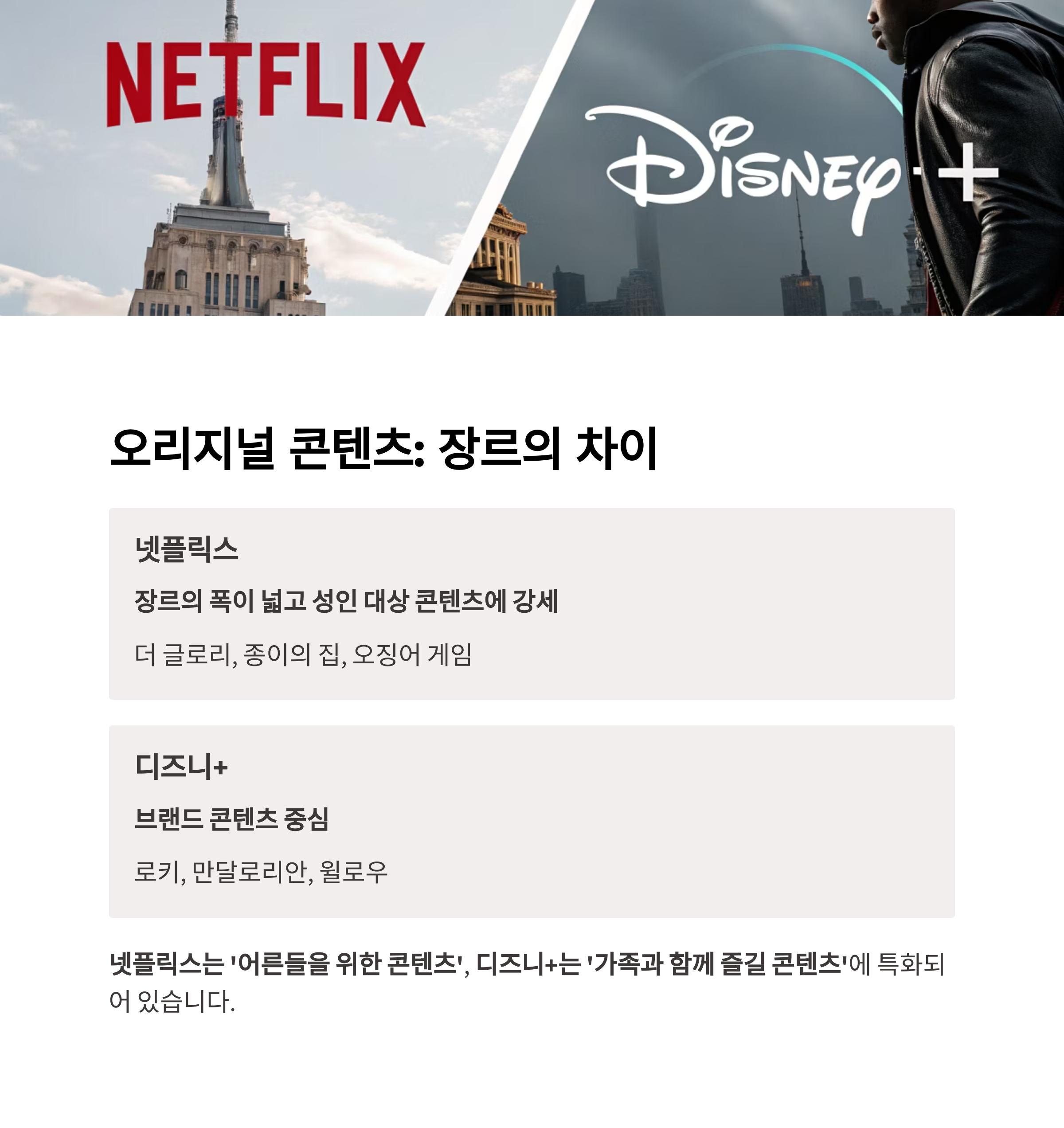 | 오리지널 콘텐츠 강세 | 전 세계 다양한 장르 | 마블·디즈니·픽사 중심 |