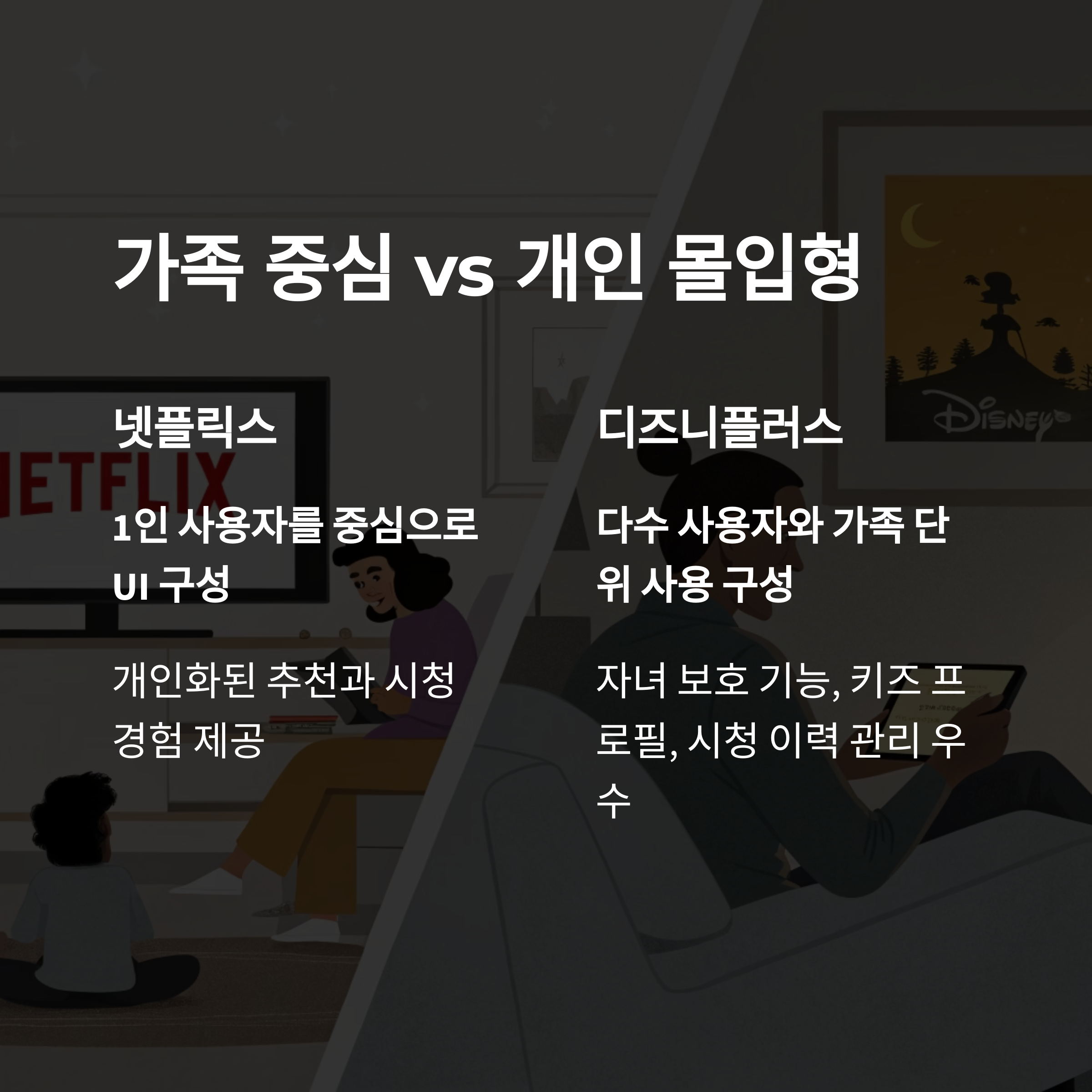 넷플릭스는 1인 사용자를 중심으로 UI가 구성되어 있고,