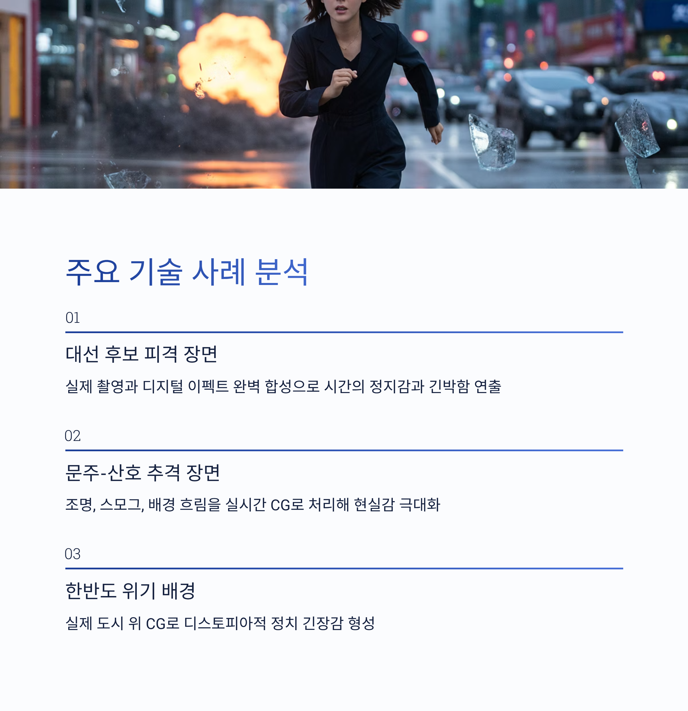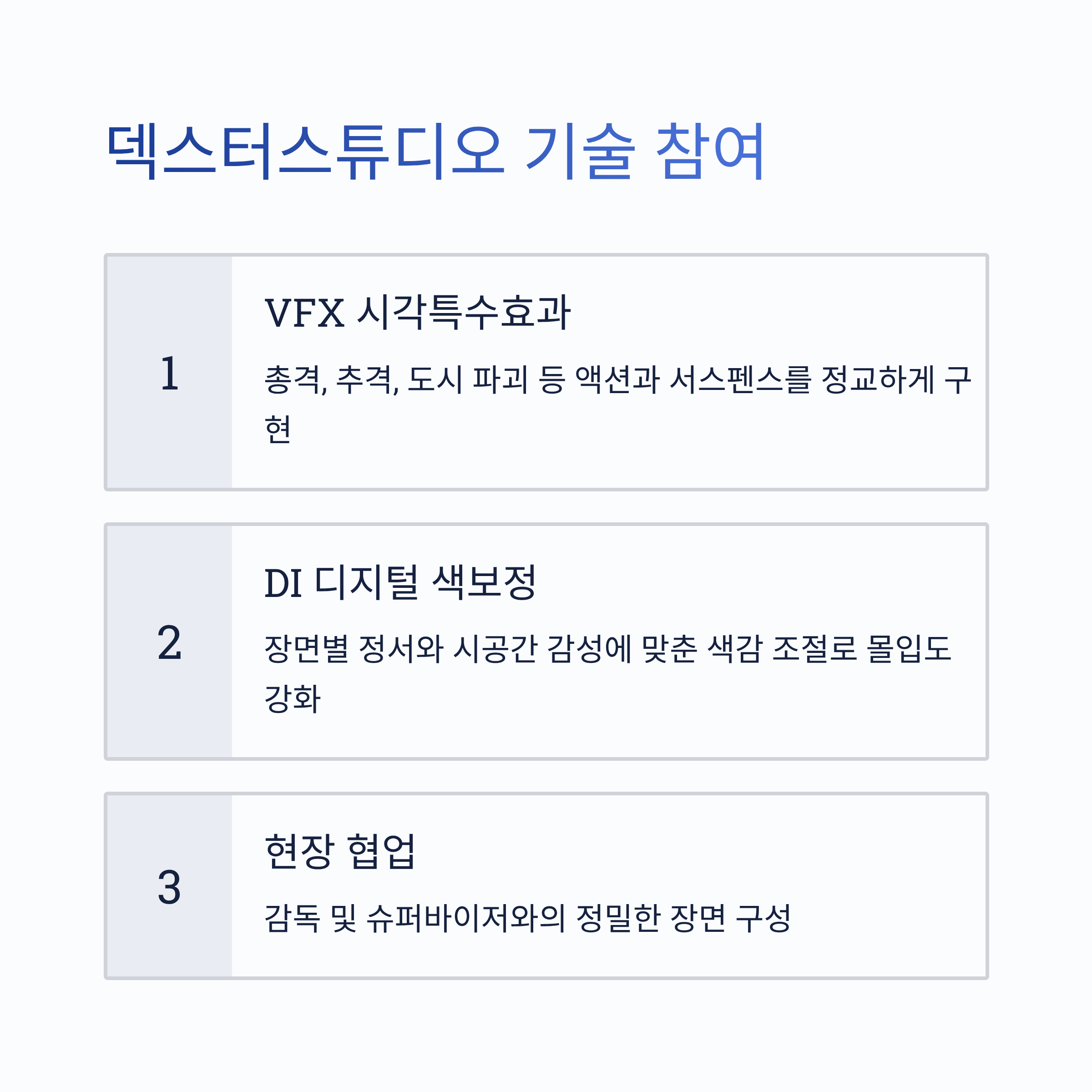 | ✅ 주요 기술 | 액션 시퀀스 CG, 디지털 색보정, 복합 장르 시각 연출 |