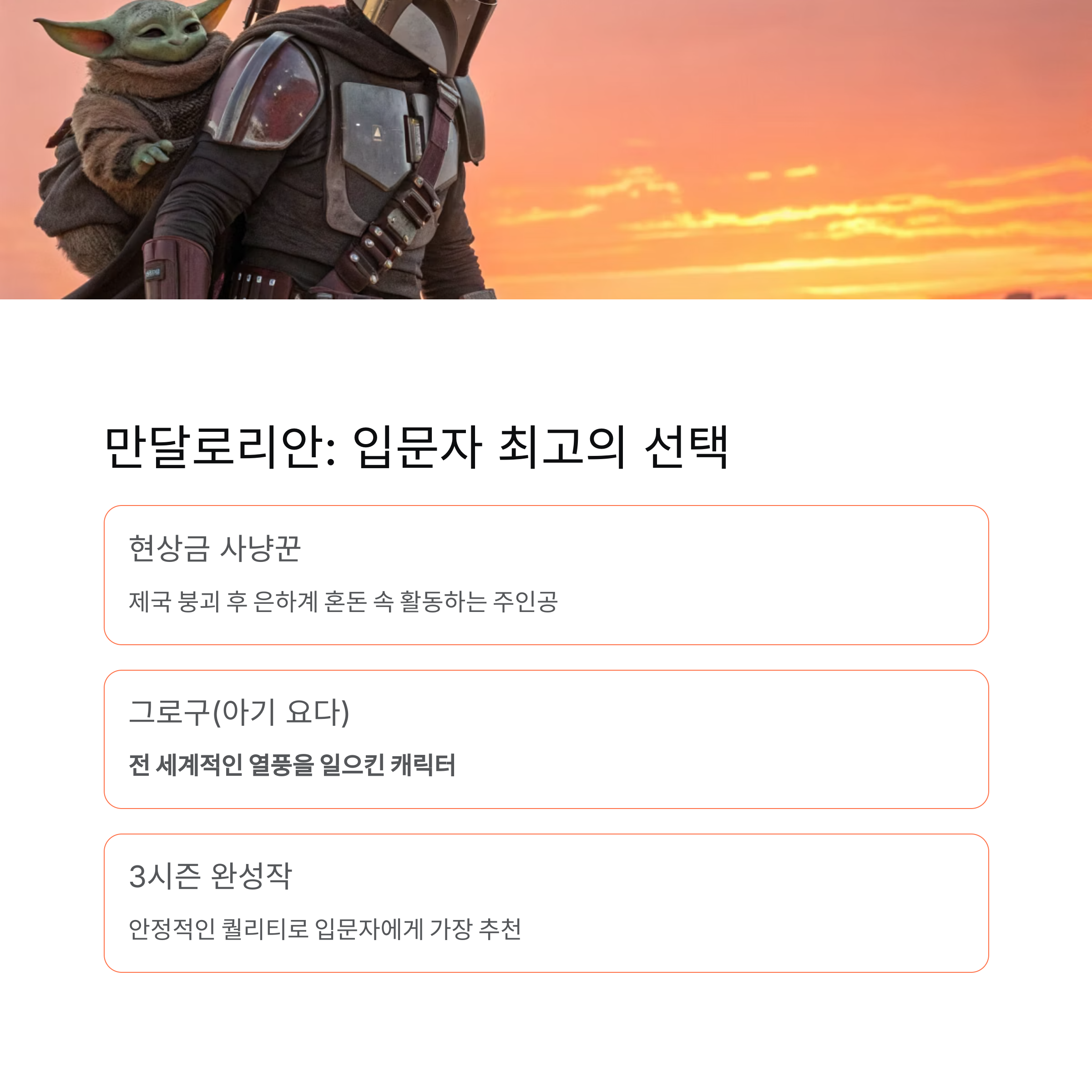| 만달로리안 | 드라마 | 디른 자린, 그로구 | 하 | 입문자 추천 |