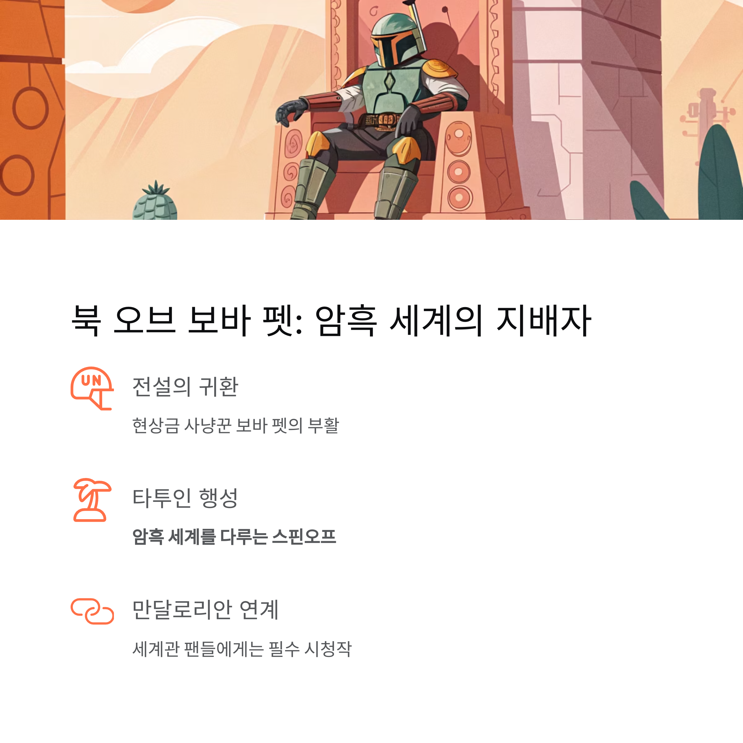 전설적인 현상금 사냥꾼 보바 펫의 부활과 타투인 행성의 암흑 세계를 다룹니다.