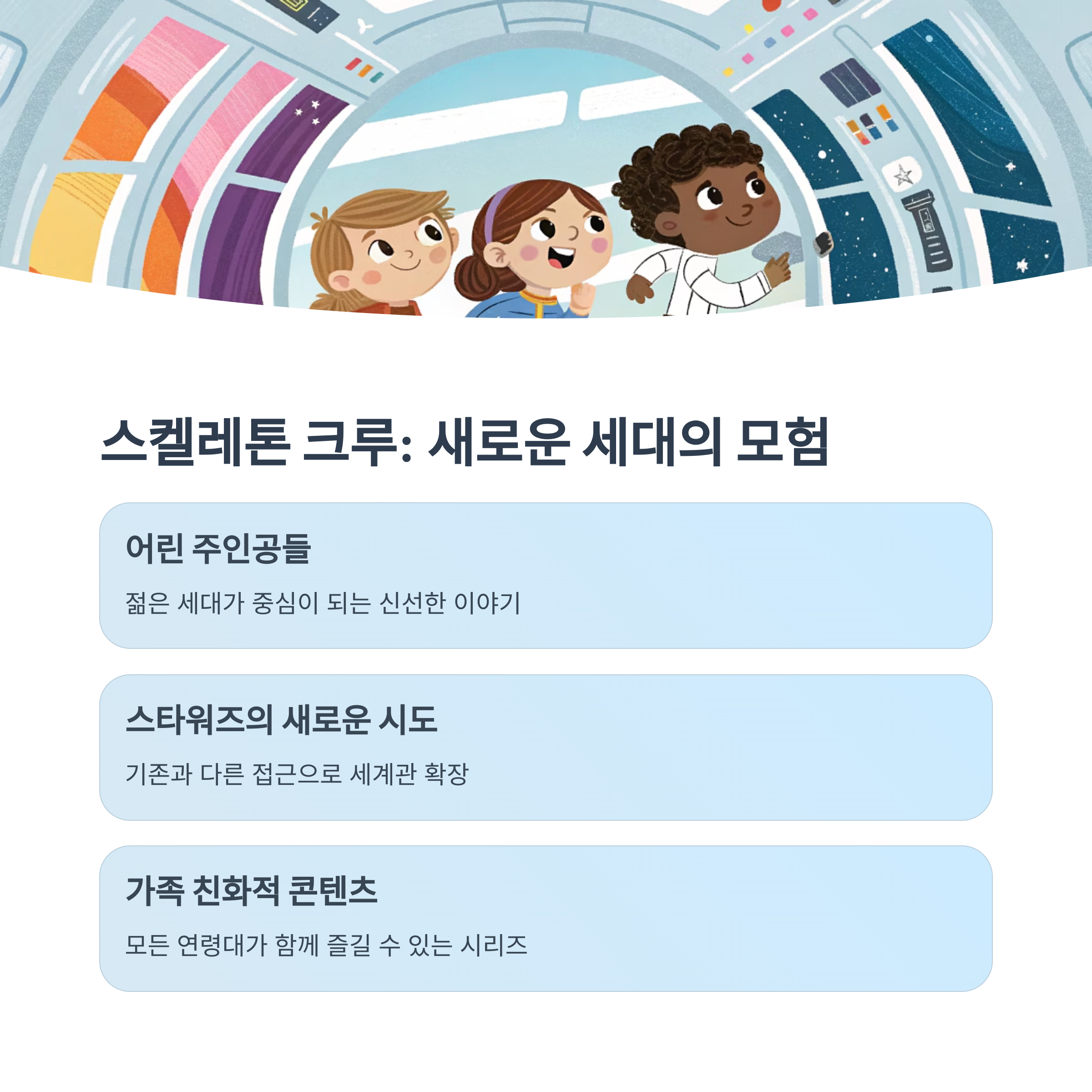 "스켈레톤 크루"는 어린 주인공들이 중심이 되어 펼쳐지는 모험을 그린 시리즈로, 스타워즈 세계관의 새로운 시도를 보여줍니다. 이 시리즈는 가족 모두가 함께 즐길 수 있는 콘텐츠로 주목받고 있습니다.