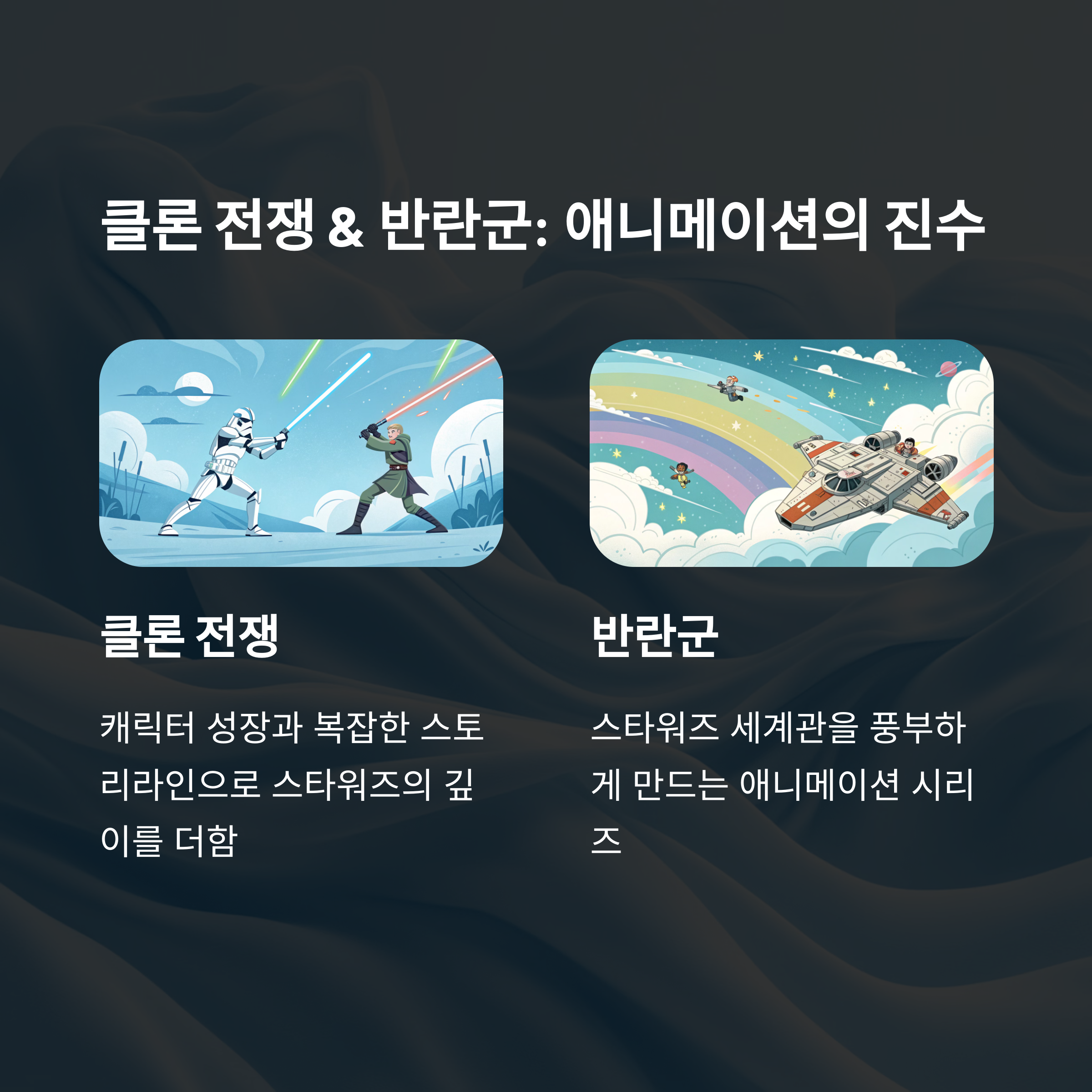 "클론 전쟁"과 "반란군"은 스타워즈 세계관을 더욱 풍부하게 만들어주는 애니메이션 시리즈입니다. 이 두 시리즈는 캐릭터들의 성장과 복잡한 스토리라인을 통해, 스타워즈의 깊이를 더합니다.