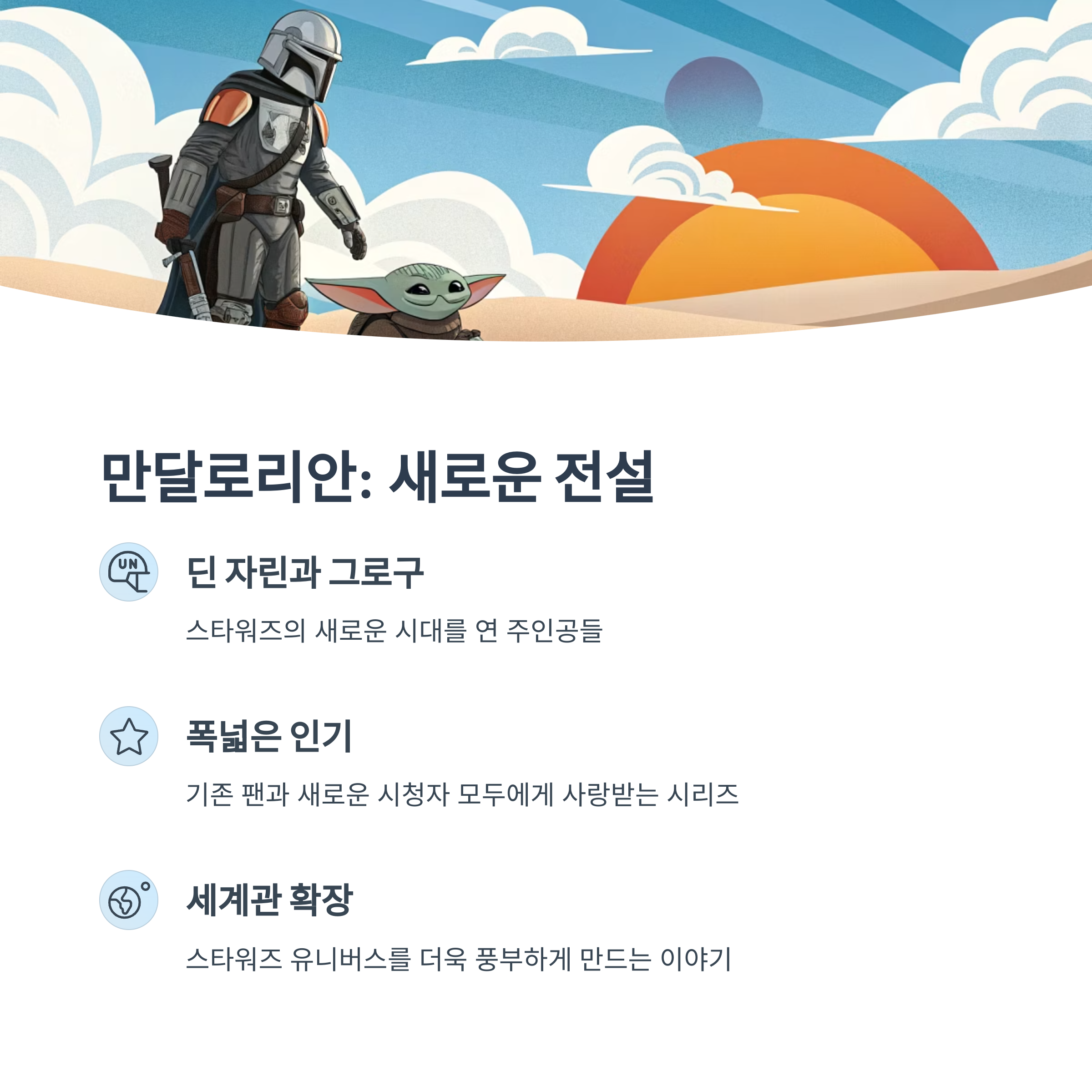 "만달로리안"은 스타워즈의 새로운 시대를 연 시리즈로, 주인공 딘 자린과 그로구(일명 베이비 요다)의 이야기를 중심으로 전개됩니다. 이 시리즈는 기존 팬뿐만 아니라 새로운 시청자들에게도 큰 인기를 끌며, 스타워즈 세계관의 확장을 이끌었습니다.