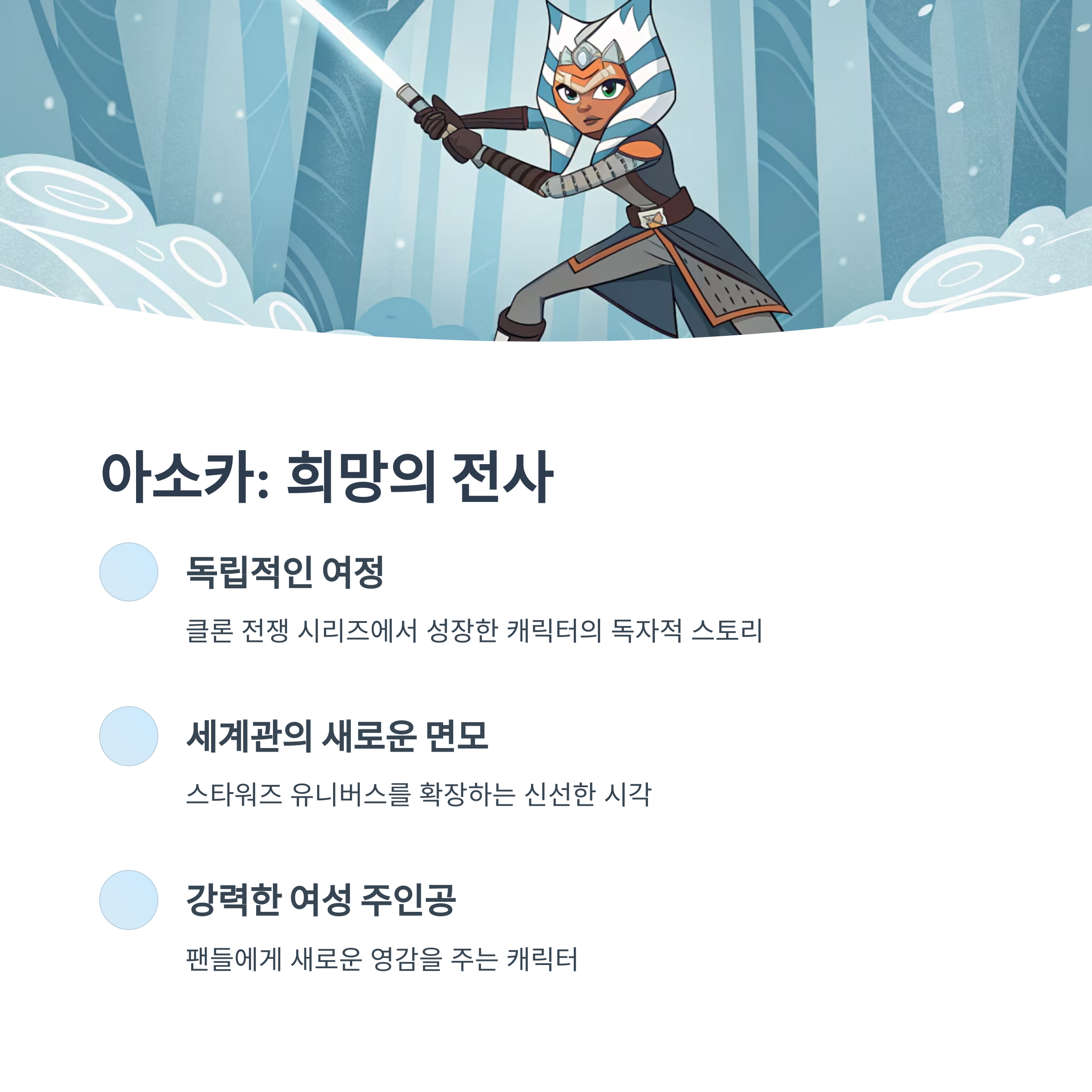"아소카"는 클론 전쟁 시리즈에서 등장한 아소카 타노의 이야기를 다룹니다. 이 시리즈는 아소카의 독립적인 여정을 통해 스타워즈 세계관의 새로운 면모를 보여주며, 팬들에게 신선한 감동을 제공합니다.