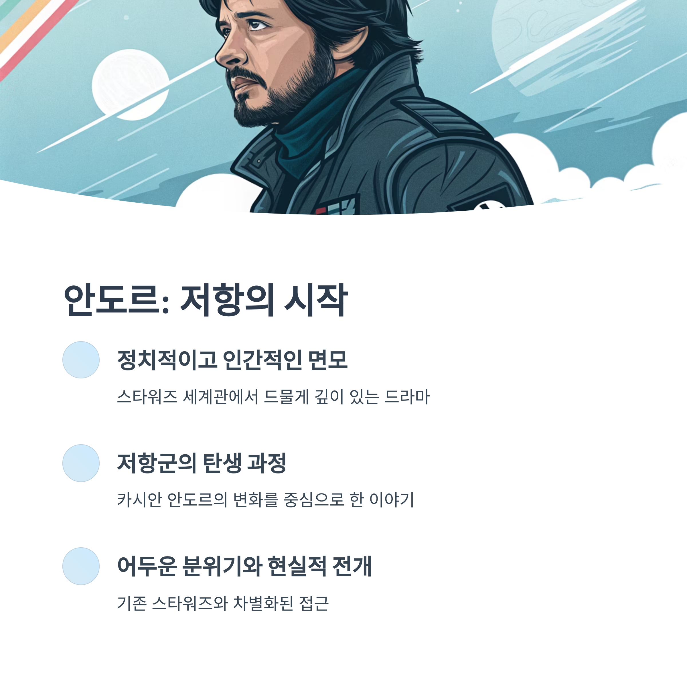 "안도르"는 스타워즈 세계관에서 드물게 정치적이고 인간적인 면모를 깊이 있게 다룬 시리즈입니다. 주인공 카시안 안도르의 변화를 중심으로, 제국에 맞서는 저항군의 탄생 과정을 그립니다. 이 시리즈는 기존의 스타워즈와는 다른, 어두운 분위기와 현실적인 전개로 많은 호평을 받았습니다.