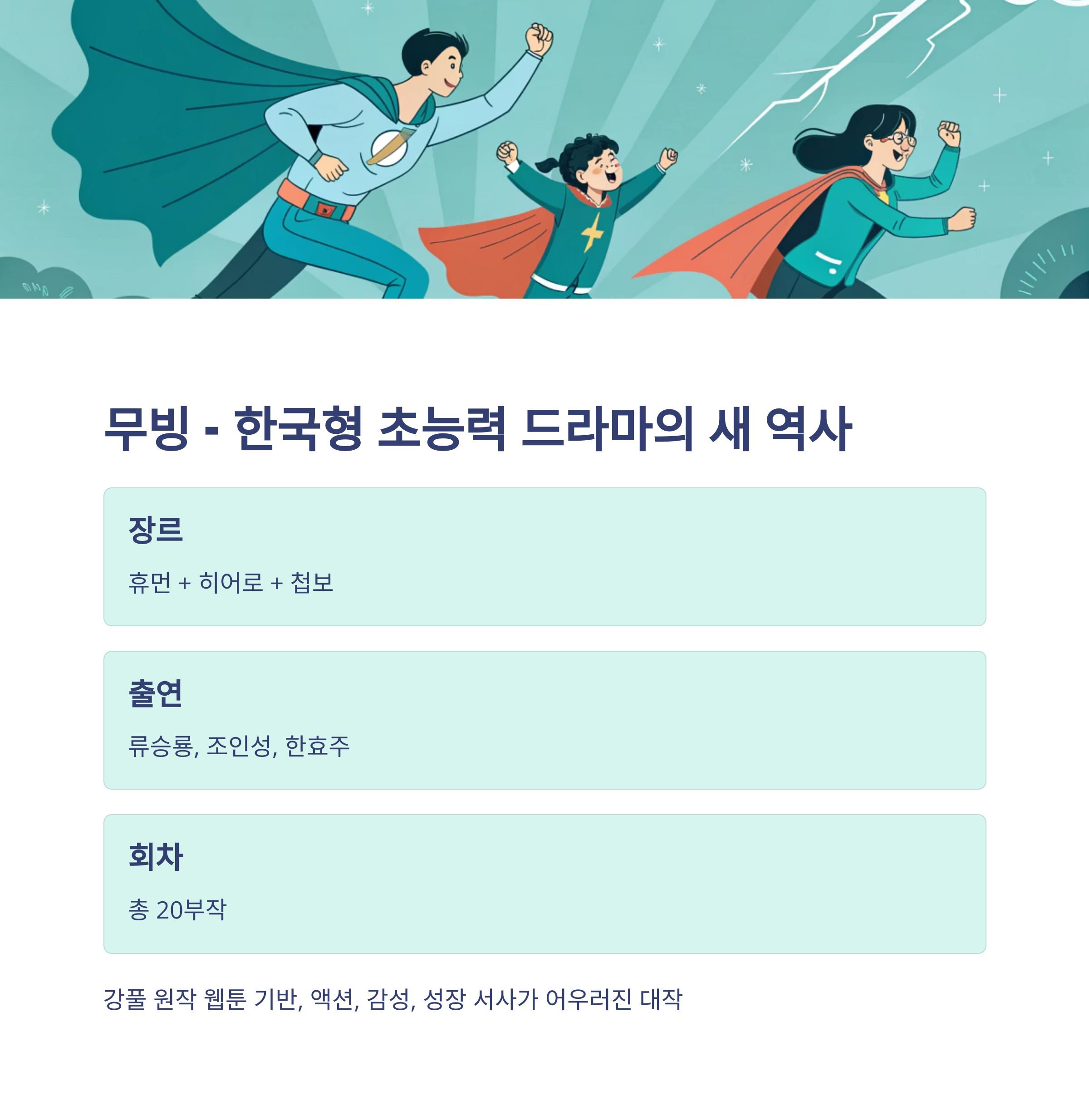 | 무빙 | 히어로, 감성 | 초능력 가족 서사 | 20부작 |