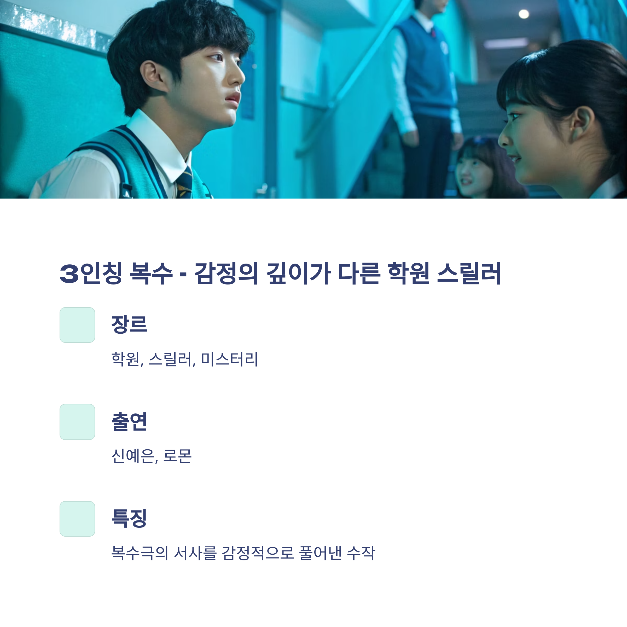 | 3인칭 복수 | 학원, 스릴러 | 감정 중심 복수극 | 12부작 |