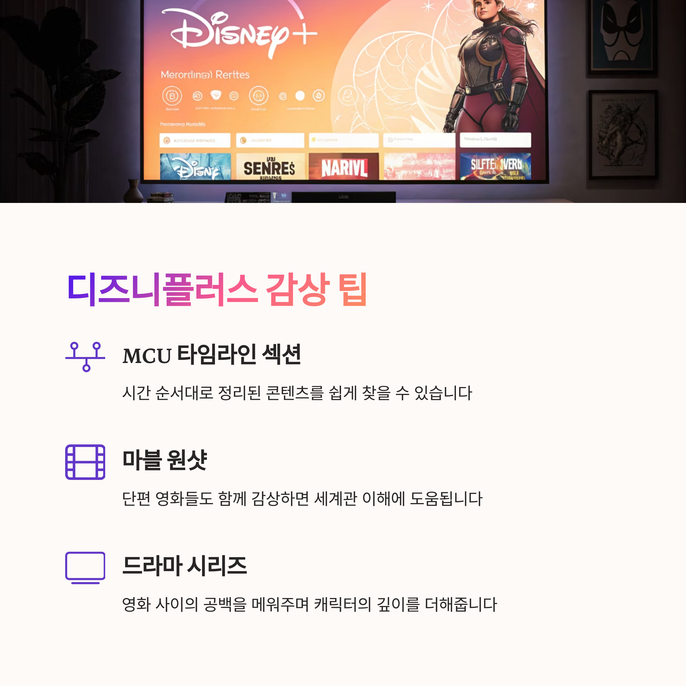 - 디즈니플러스의 'MCU 타임라인' 섹션을 활용하면 시간 순서대로 정리된 콘텐츠를 쉽게 찾을 수 있습니다.