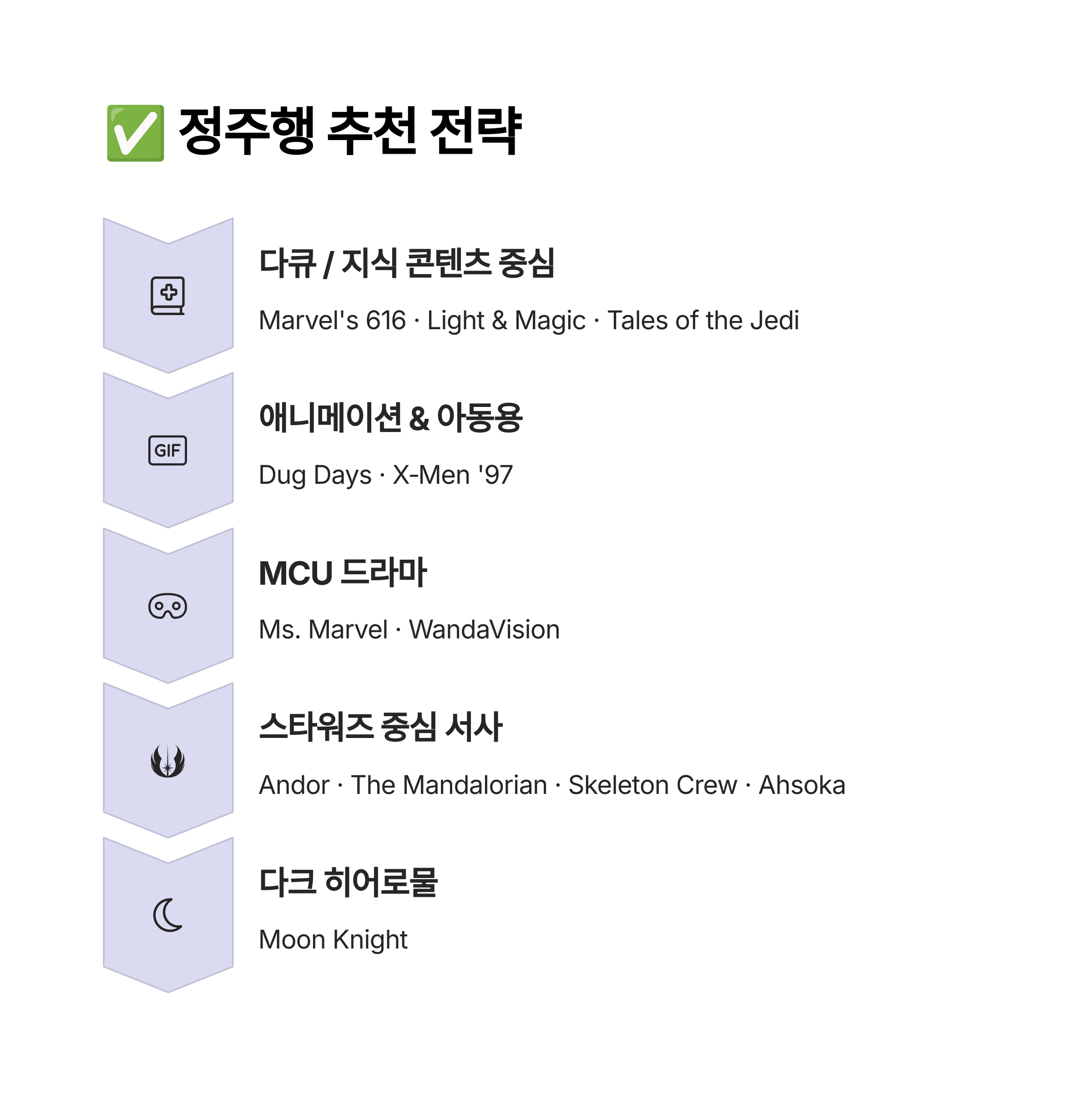 - 다큐 / 지식 콘텐츠 중심: Marvel’s 616 · Light & Magic · Tales of the Jedi