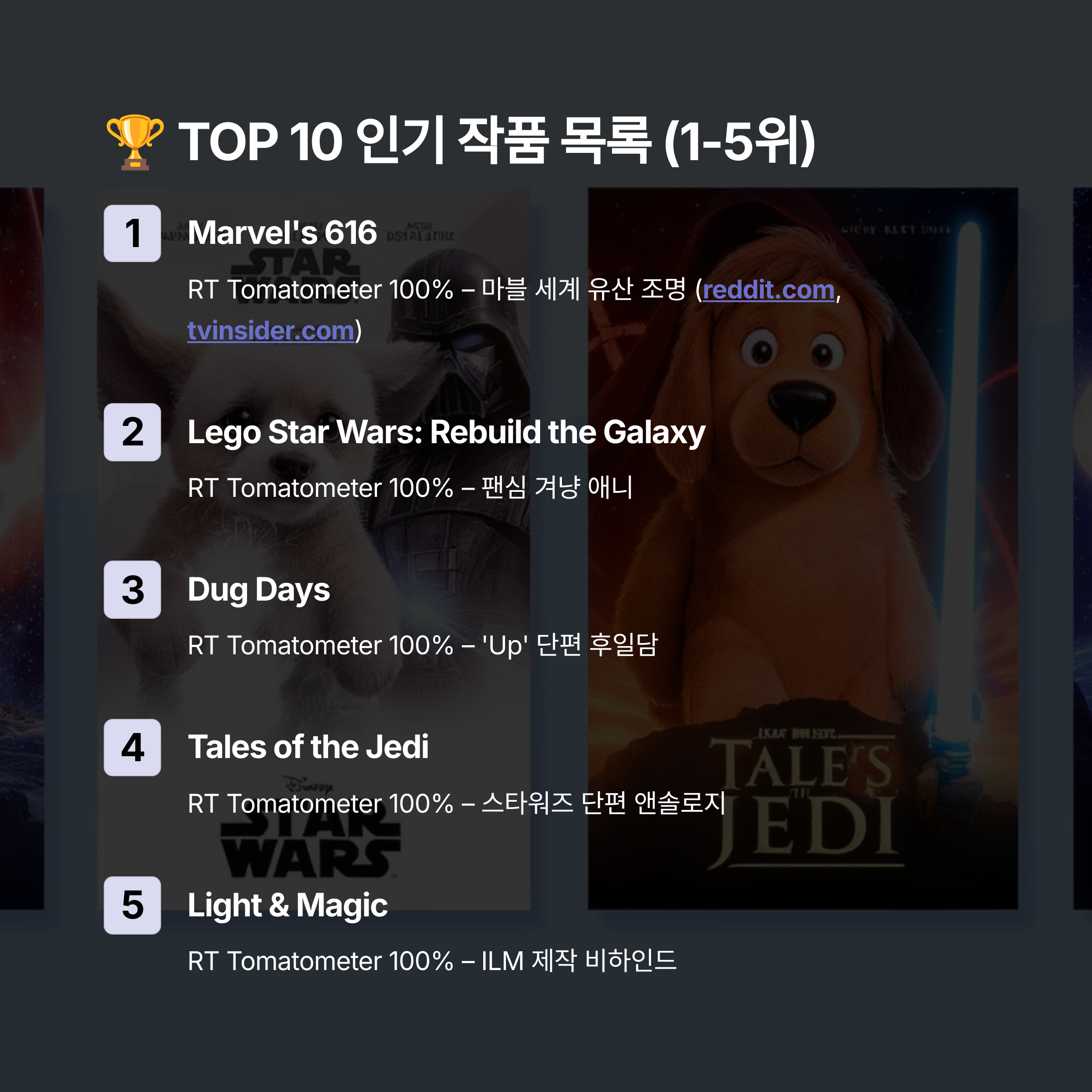 | 2 | Lego Star Wars: Rebuild the Galaxy | RT Tomatometer | 100% – 팬심 겨냥 애니 |