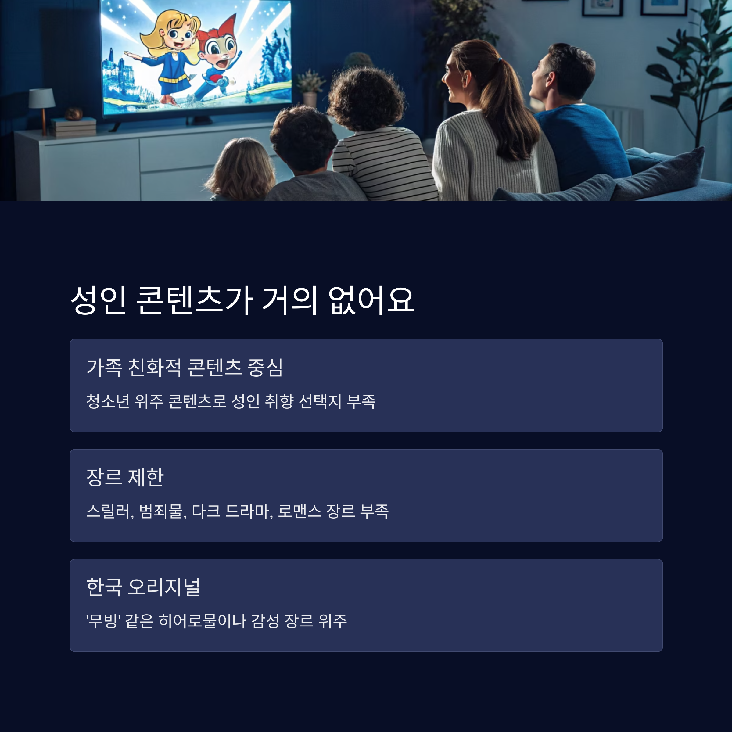 – 성인 시청자 대상 콘텐츠 볼륨 낮음