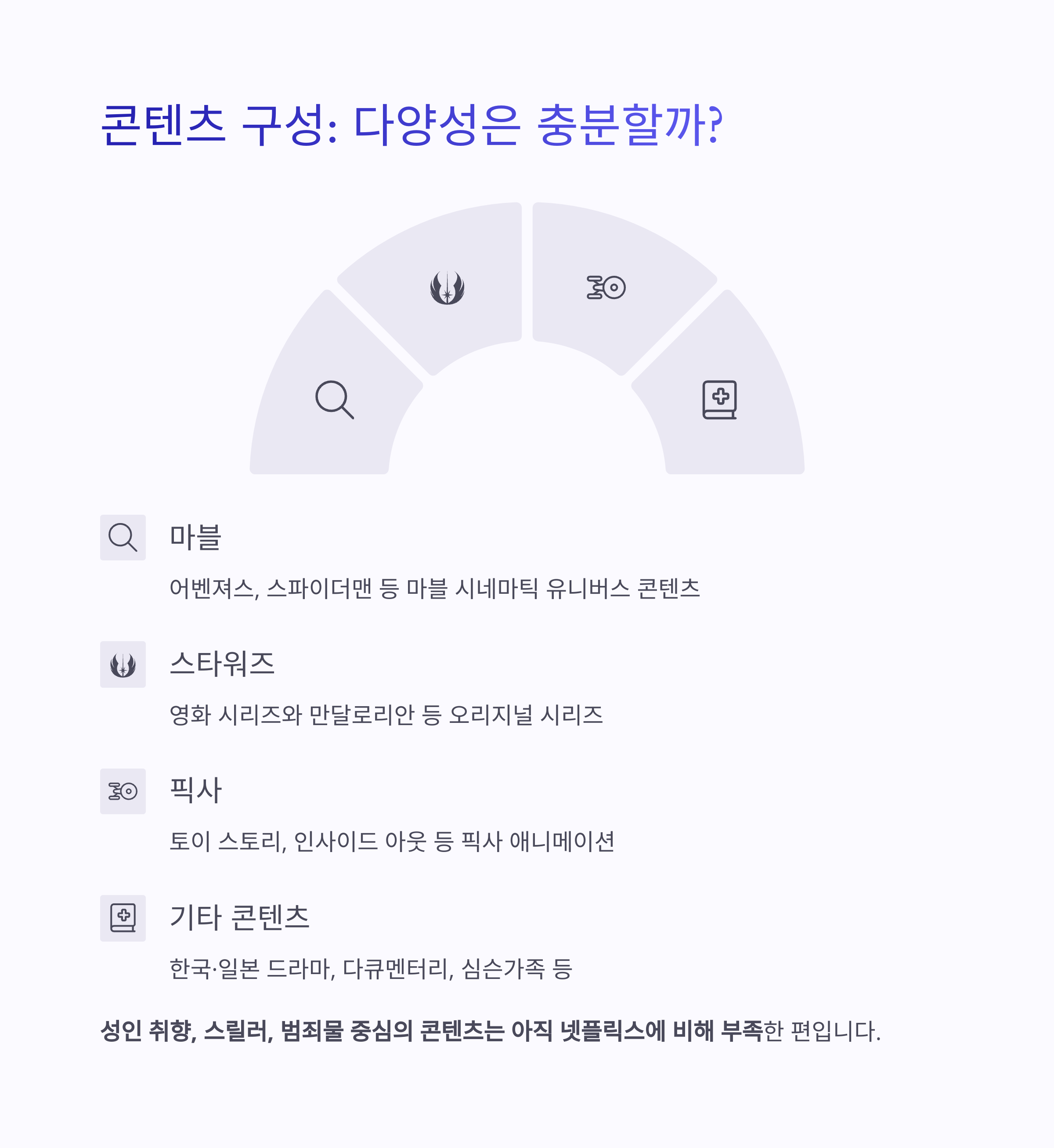콘텐츠 구성: 마블, 픽사, 스타워즈 외에도 많을까?