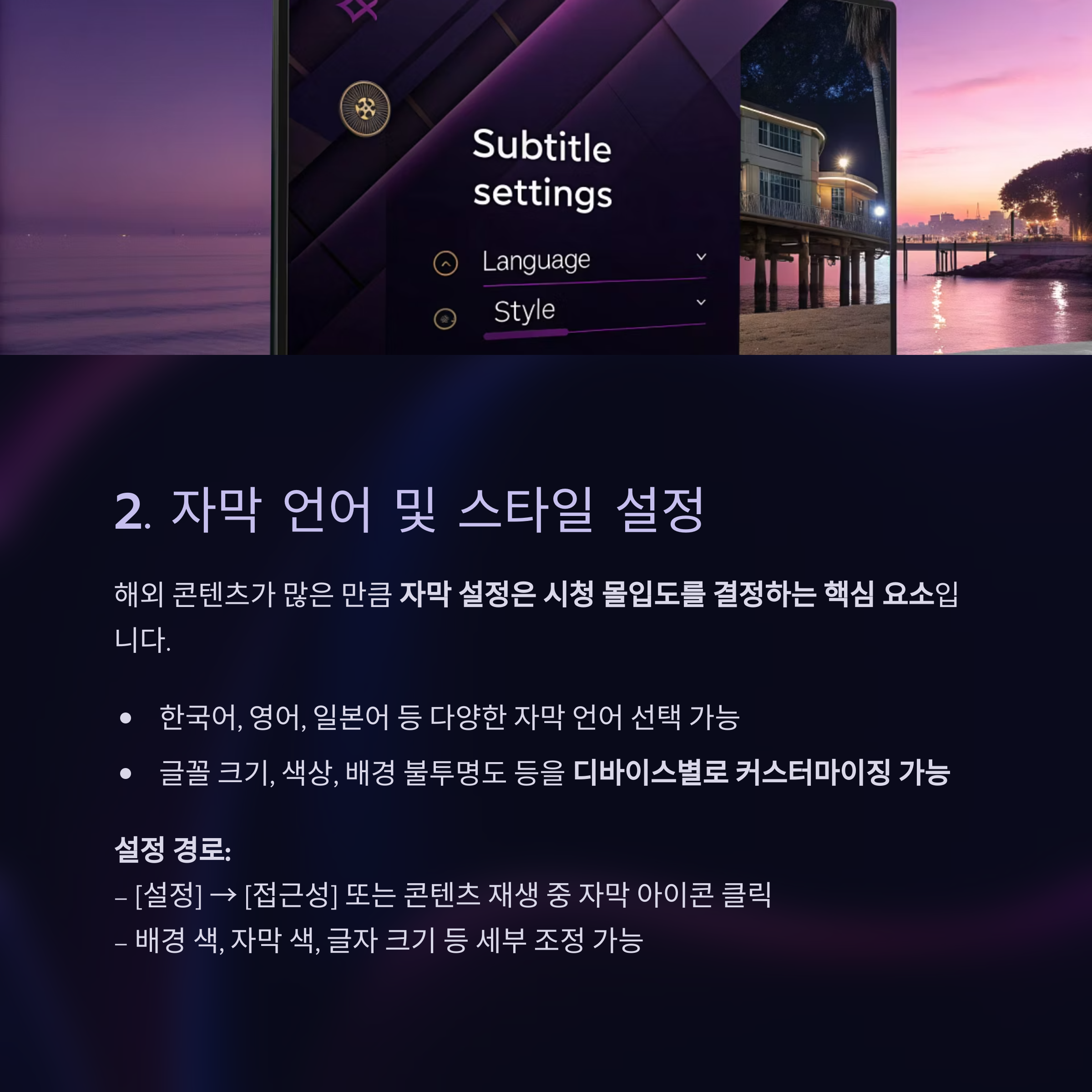 | 자막 설정 | 언어/크기/색상 조정 | 몰입도 향상 |