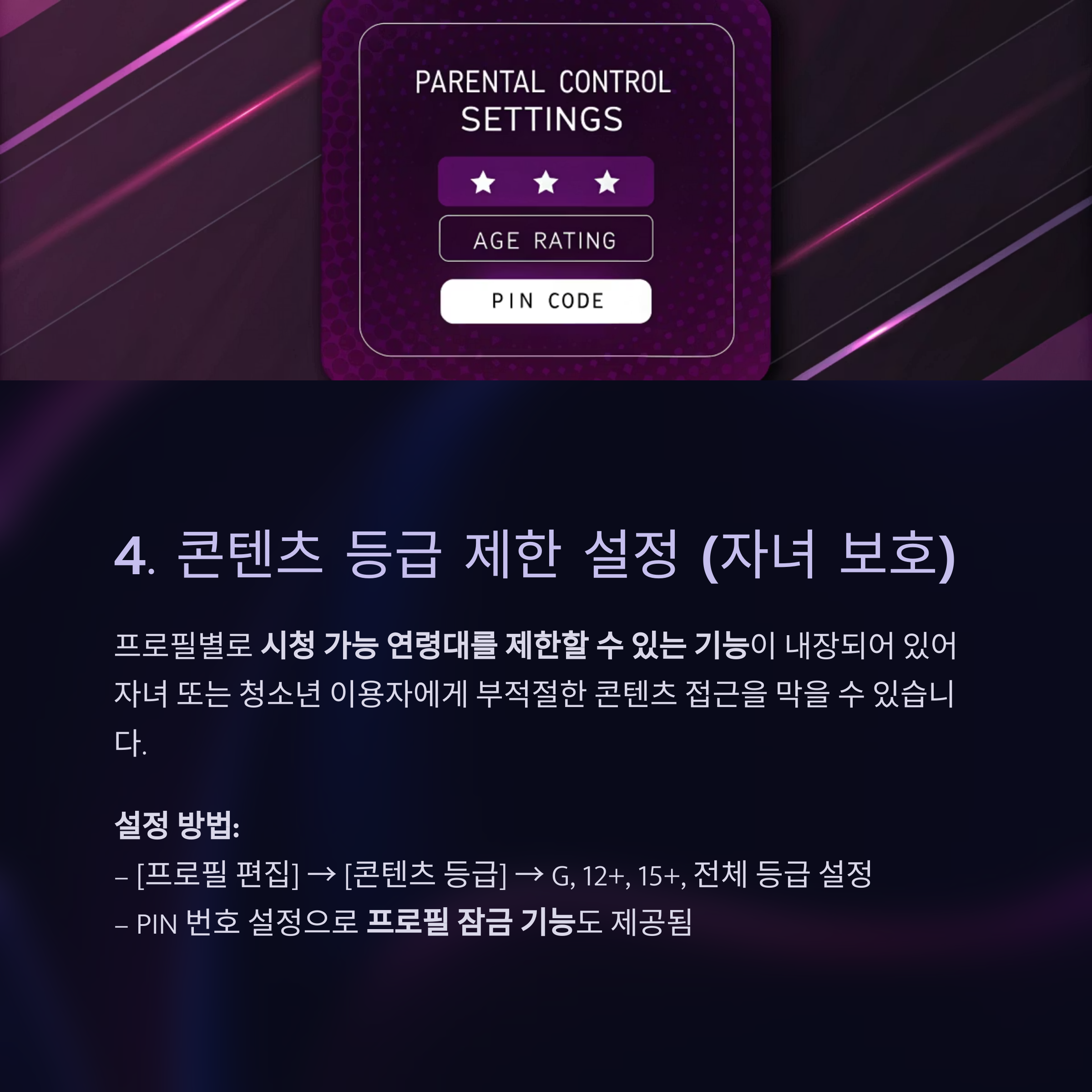 | 연령 제한 | 콘텐츠 등급 제한 + PIN 잠금 | 자녀 보호 |