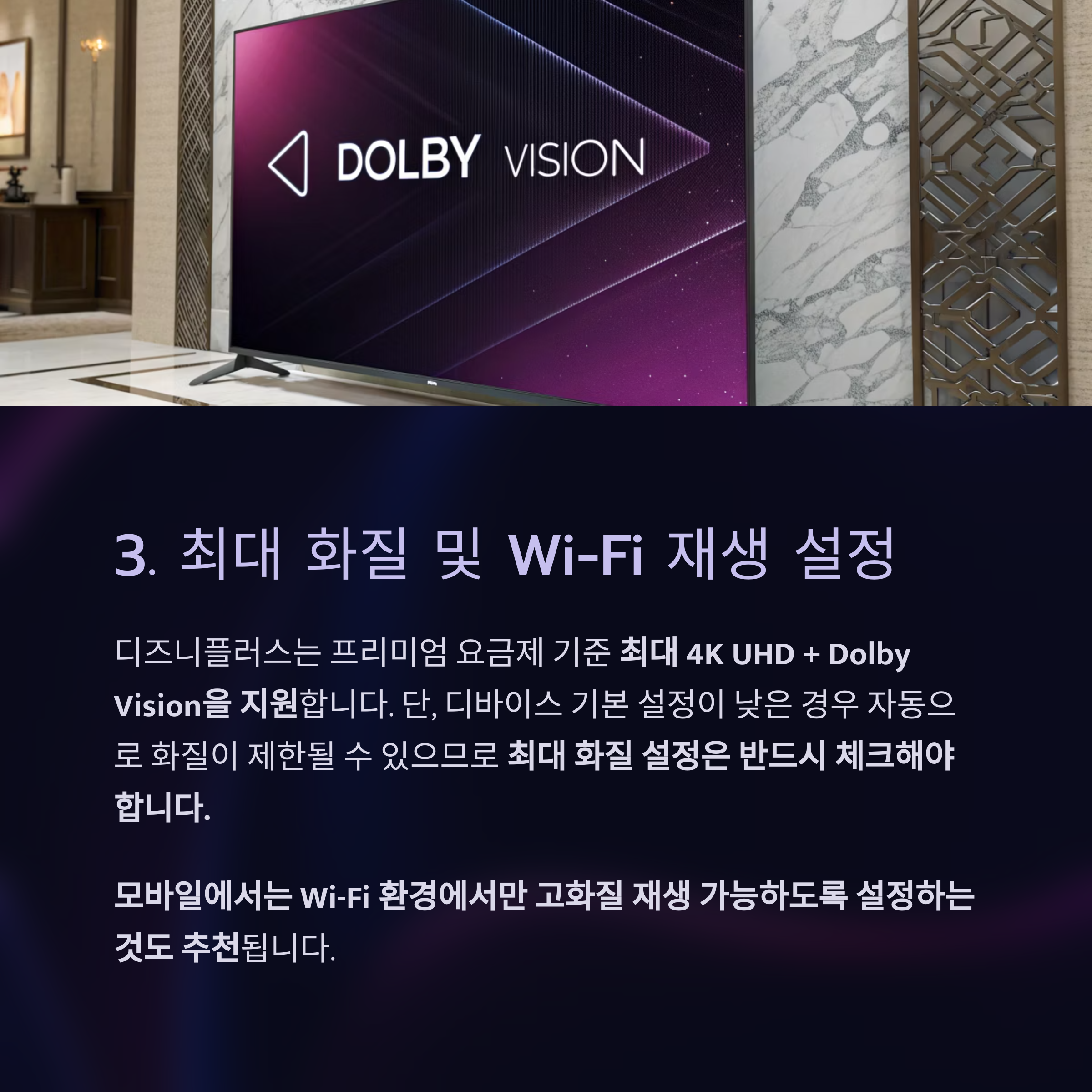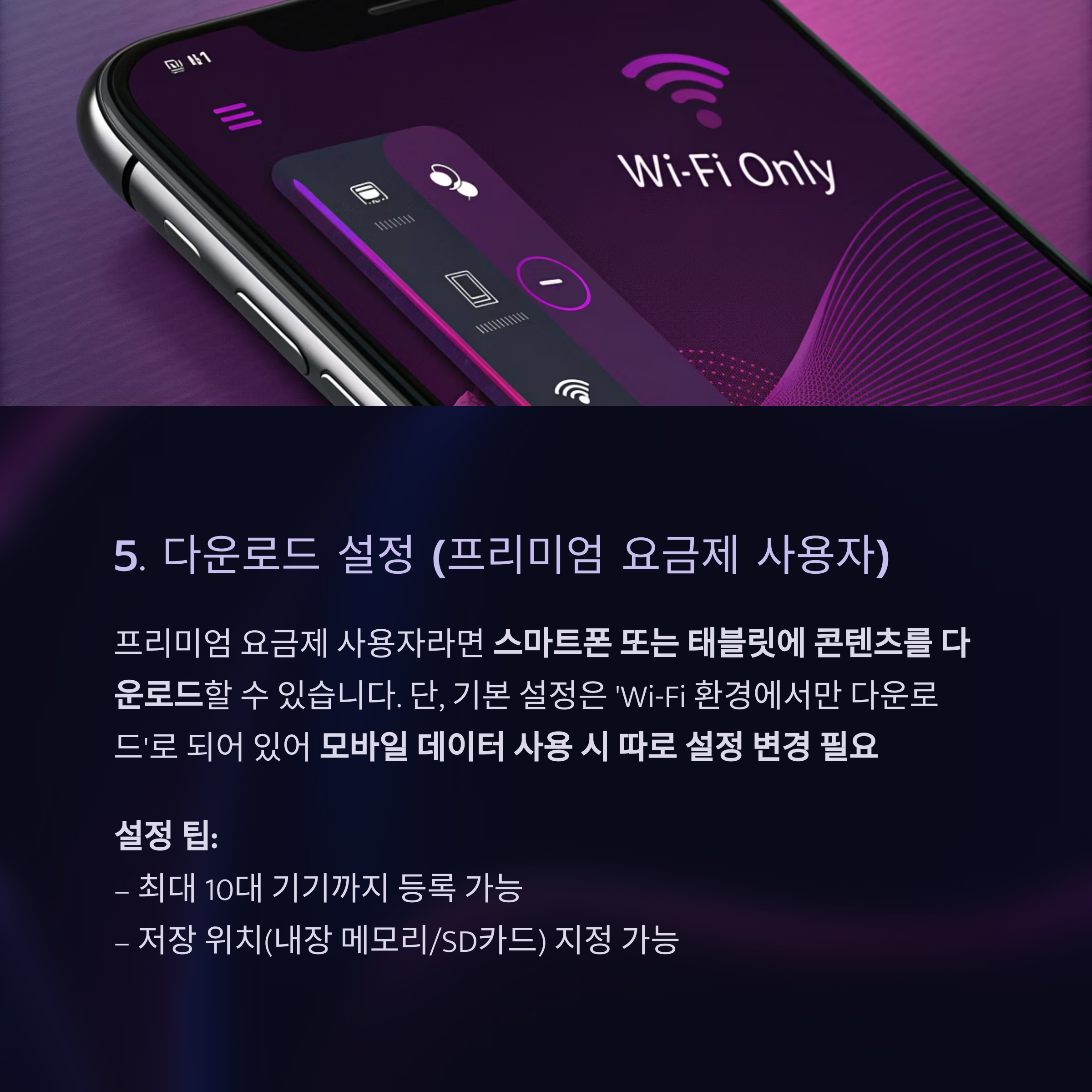 모바일에서는 Wi-Fi 환경에서만 고화질 재생 가능하도록 설정하는 것도 추천됩니다.