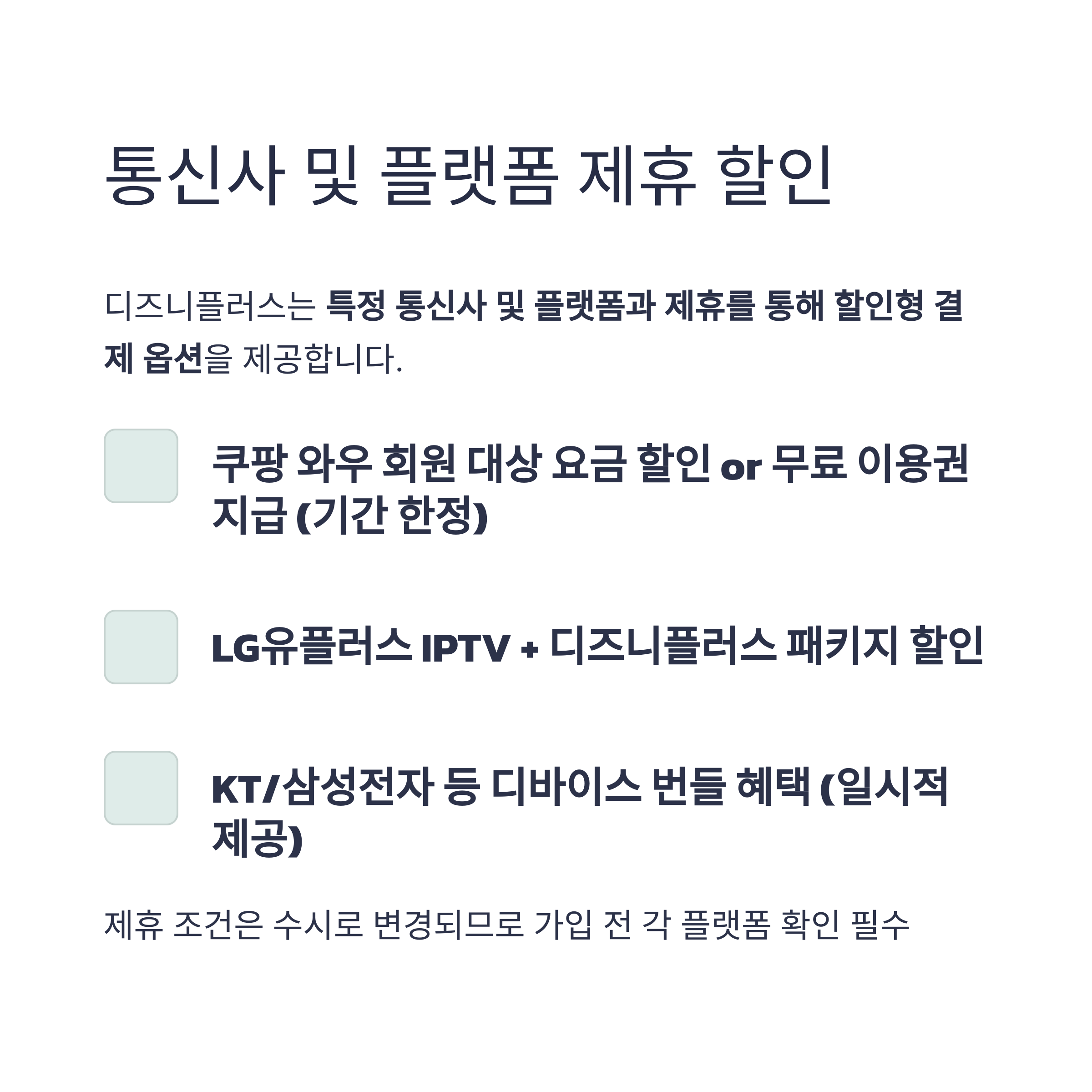 디즈니플러스는 특정 통신사 및 플랫폼과 제휴를 통해 할인형 결제 옵션을 제공합니다.
