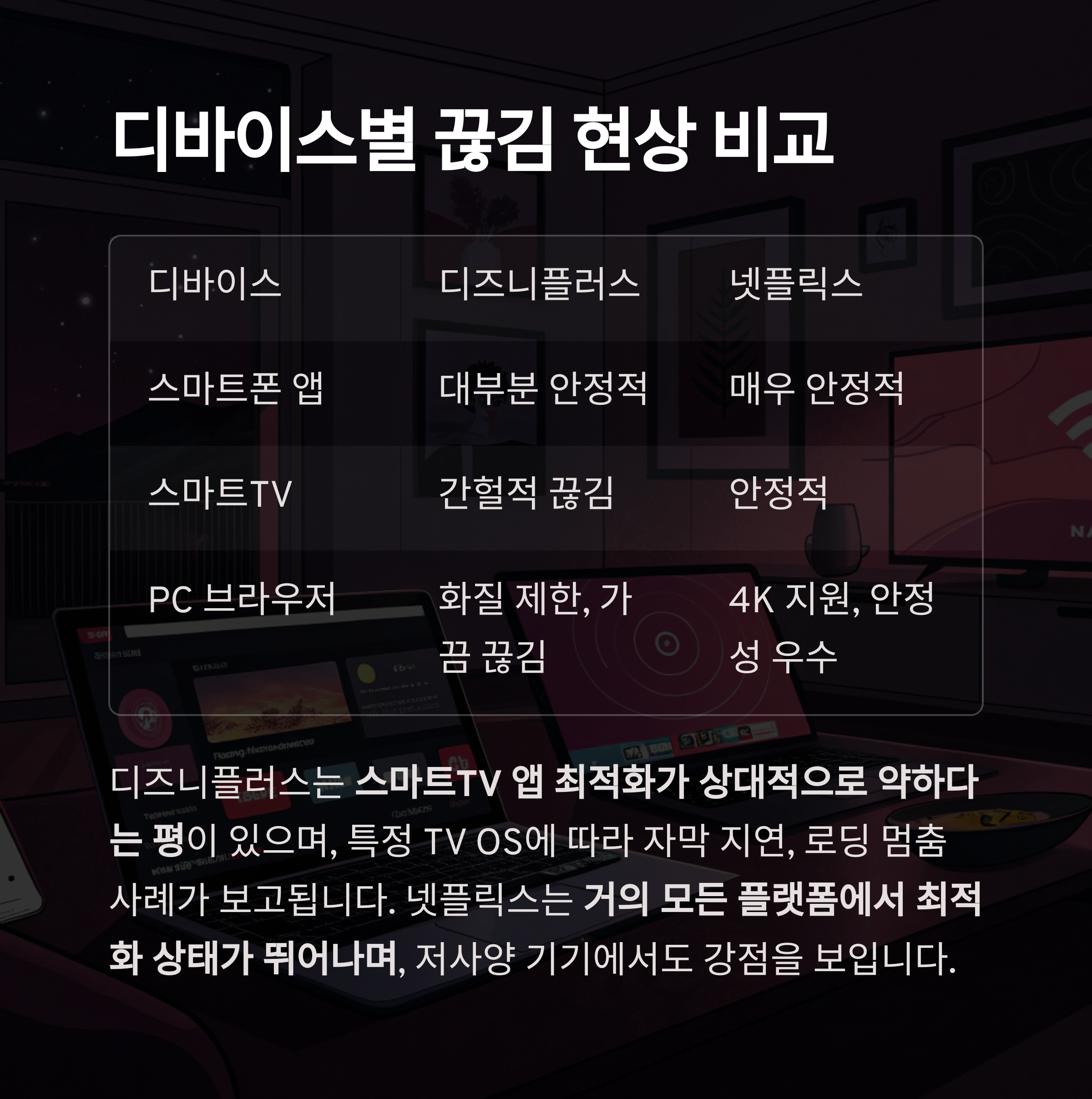 | 끊김 빈도 | △ TV/PC 앱에서 종종 있음 | ◎ 거의 없음 |