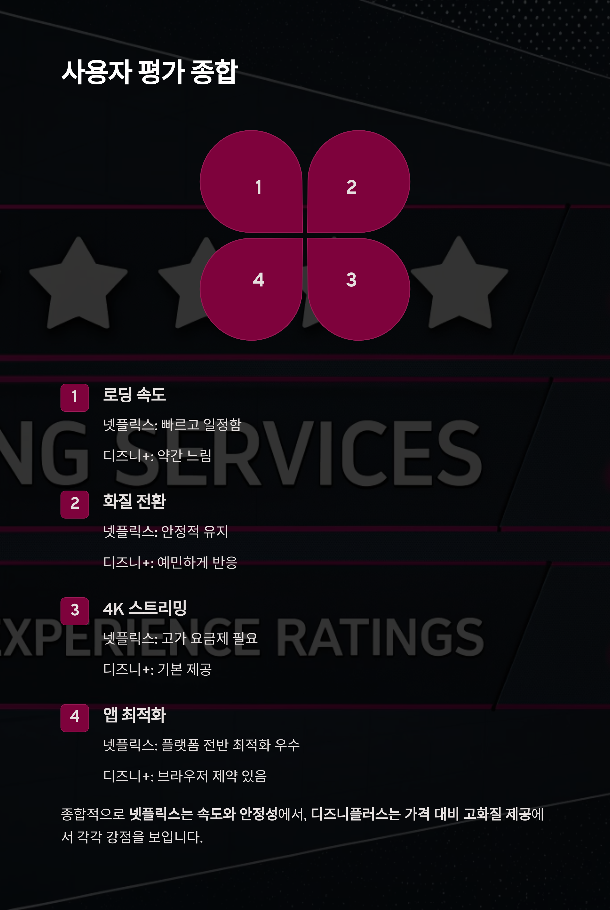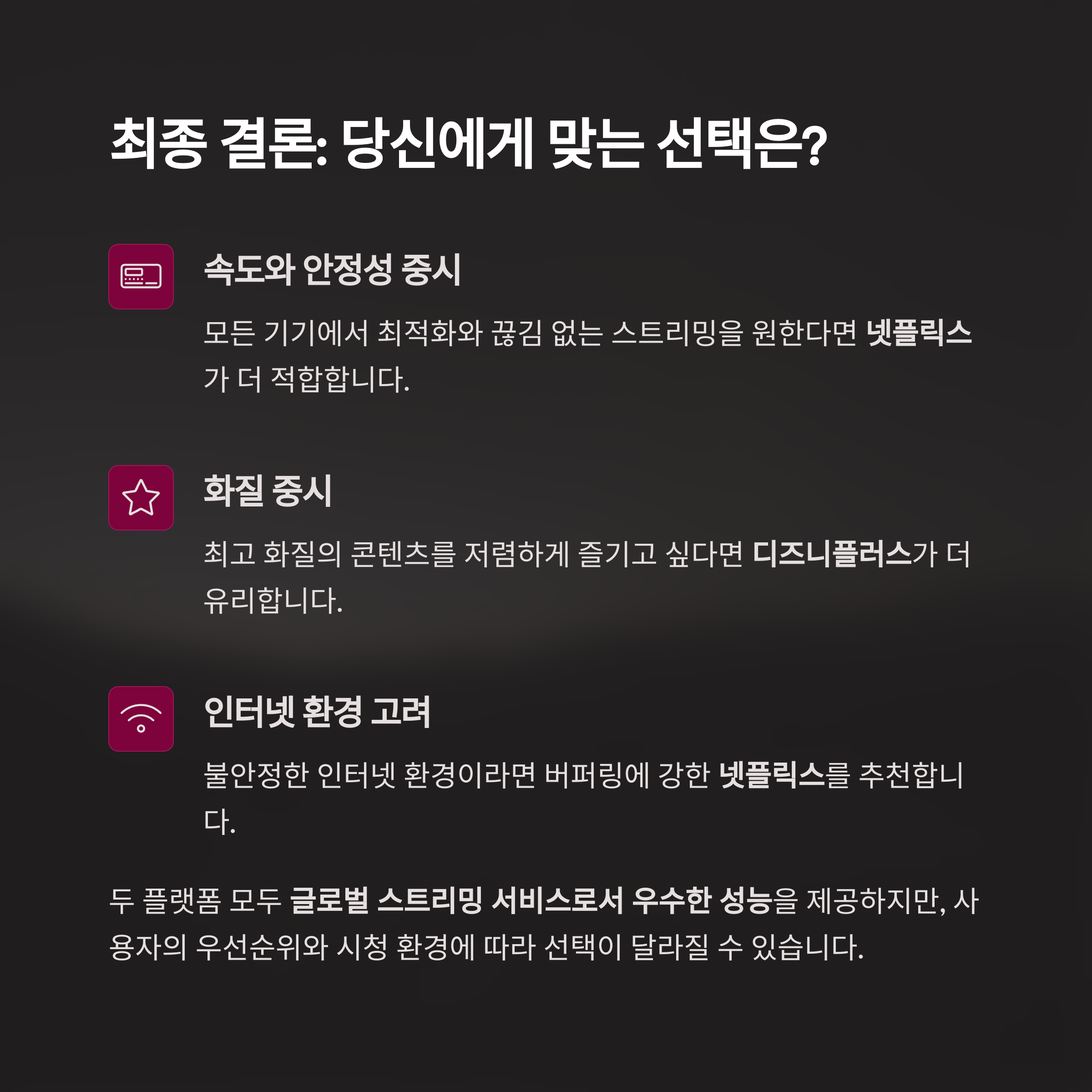 결론: 속도 안정성은 넷플릭스, 고화질 제공은 디즈니+