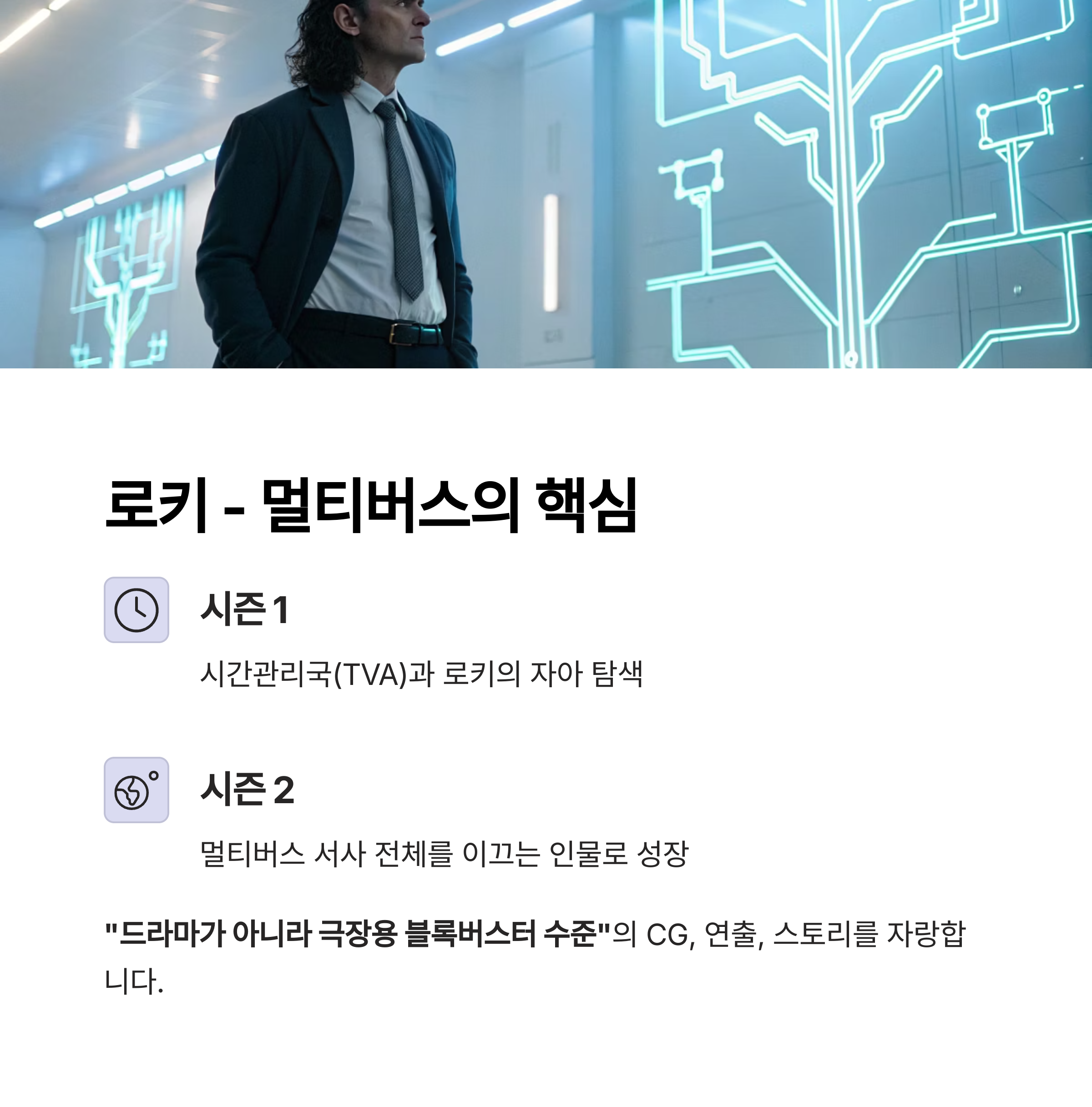 | 로키 | SF/히어로 | 멀티버스 핵심 서사 | 마블 정주행 팬 |