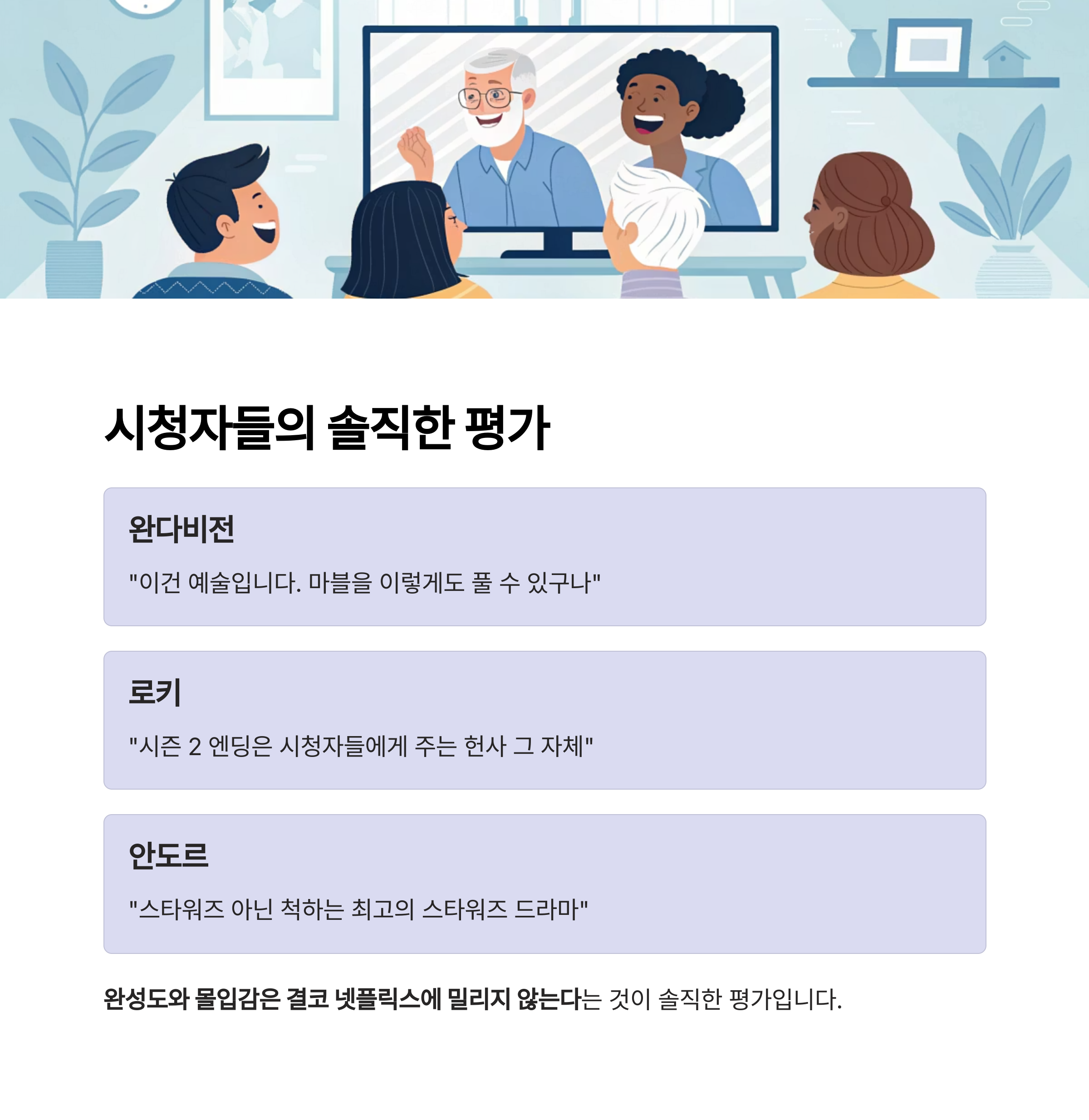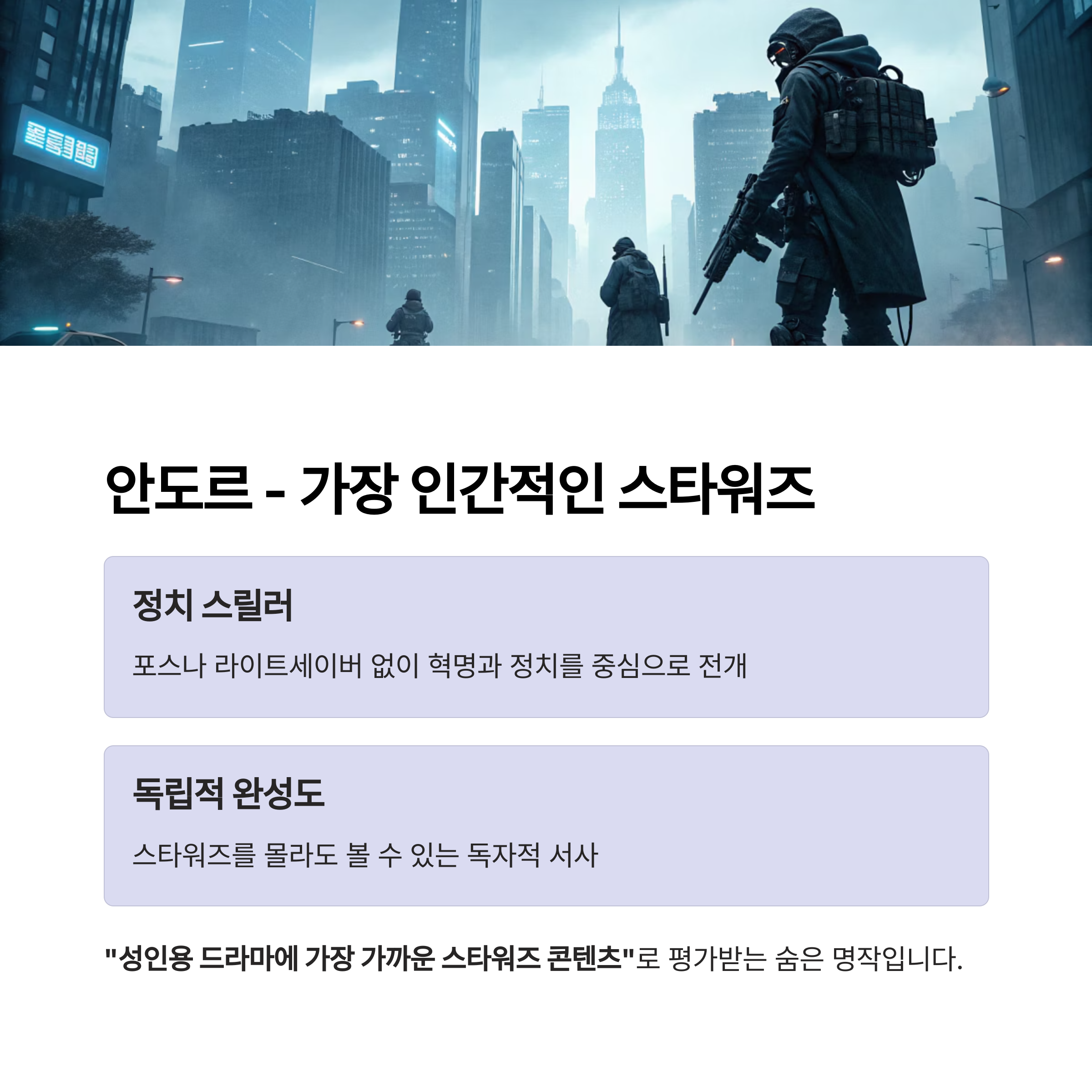 | 안도르 | 스릴러/정치 | 스타워즈 세계의 현실 정치 | SF보다 서사 중심 선호자 |
