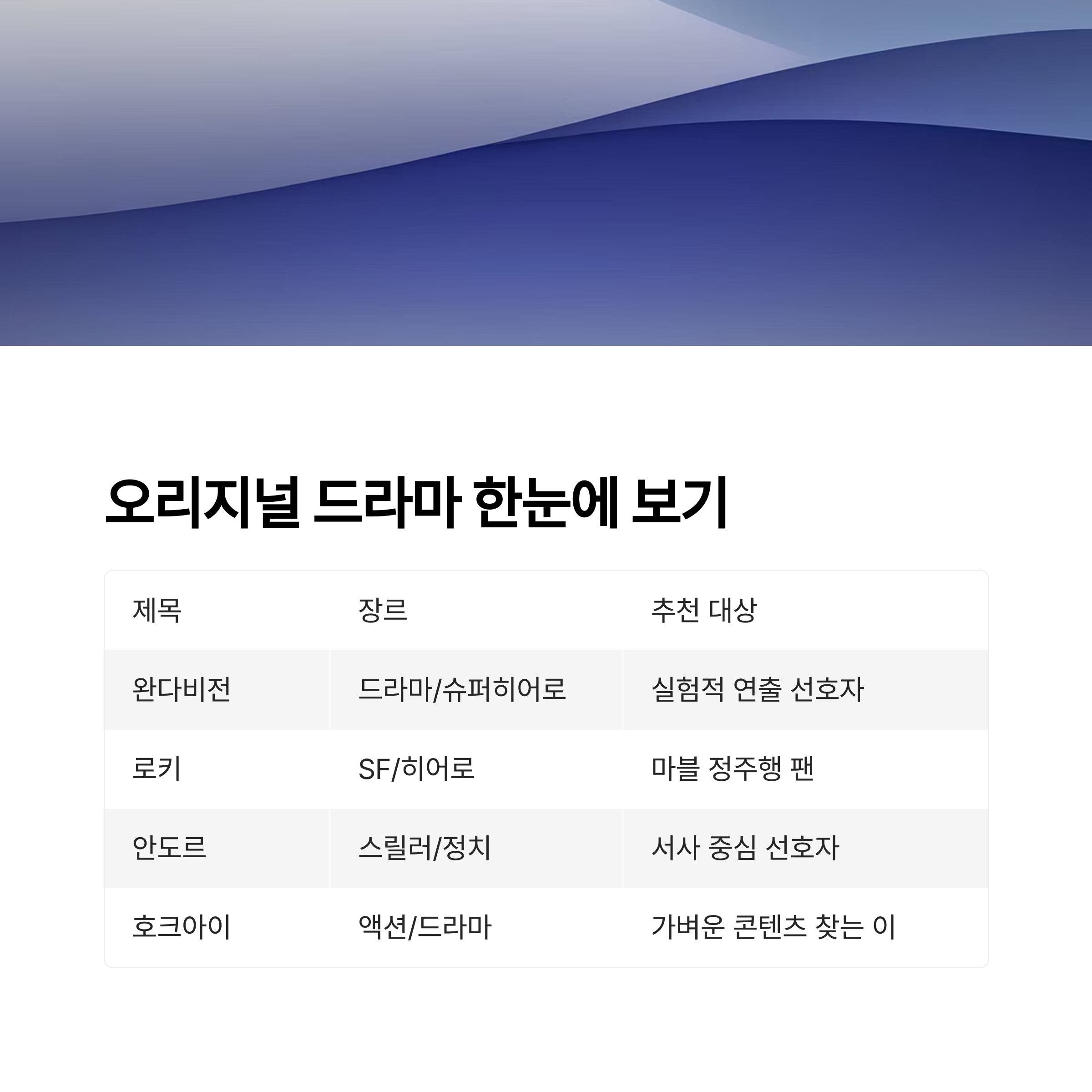 | 호크아이 | 액션/드라마 | 인간적 영웅 + 후계자 서사 | 가벼운 마블 콘텐츠 찾는 이 |