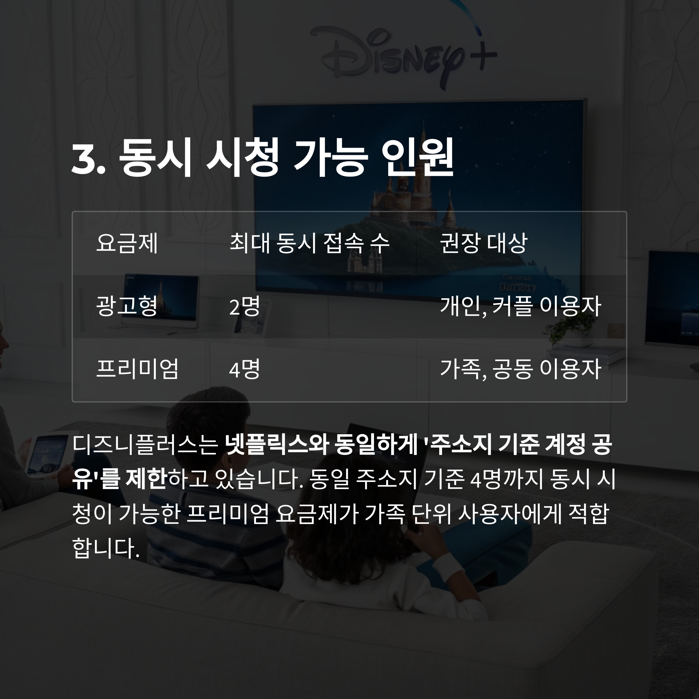 디즈니플러스는 넷플릭스와 동일하게 ‘주소지 기준 계정 공유’를 제한하고 있습니다.