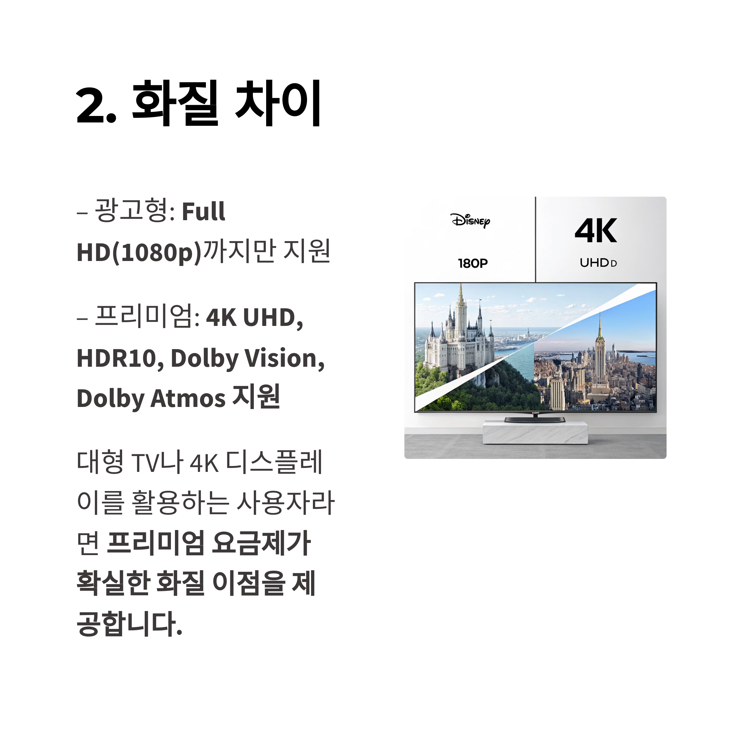 | 화질 | 최대 Full HD (1080p) | 최대 4K UHD + Dolby Vision |