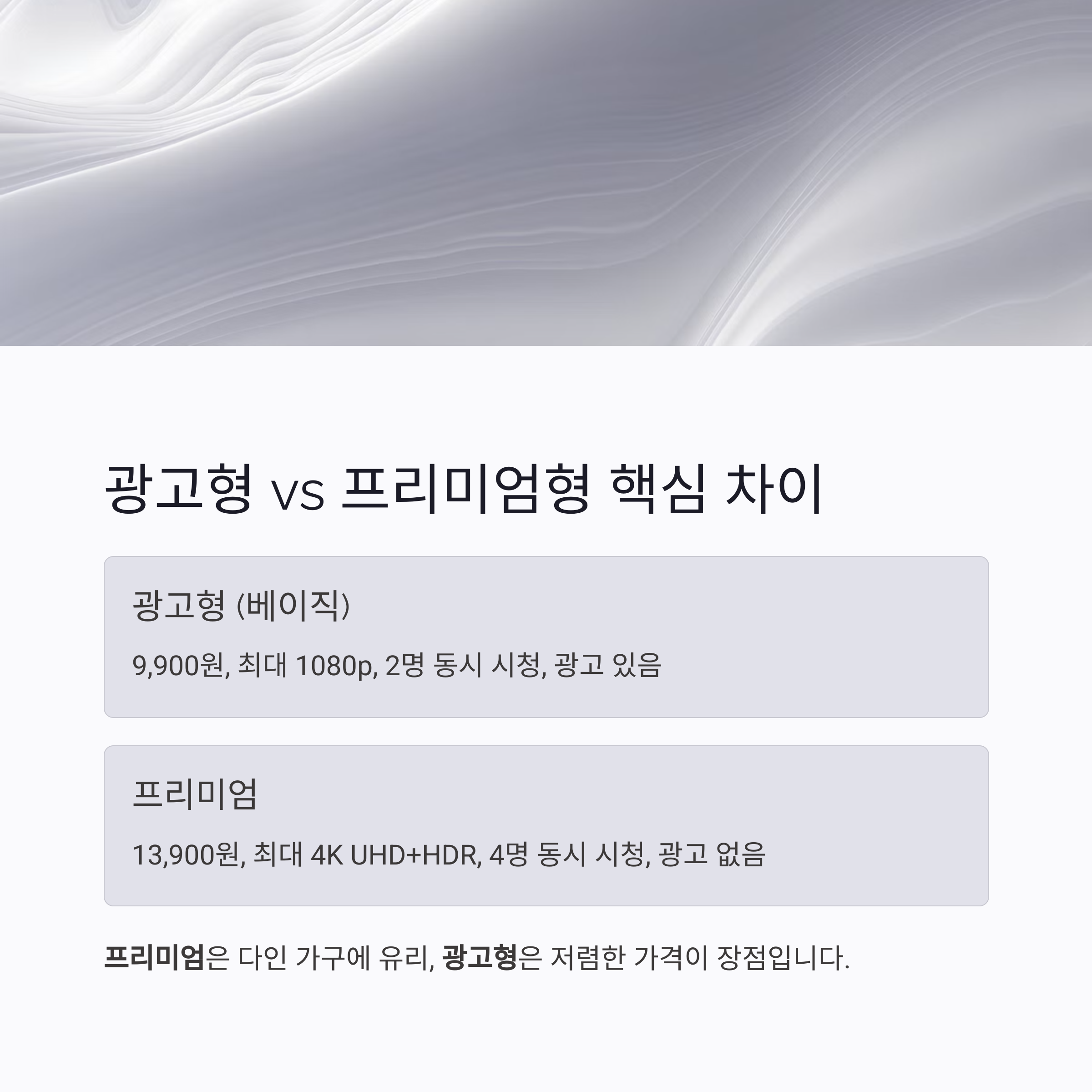 가장 큰 차이는 광고 유무와 화질, 동시 접속 가능 인원입니다.