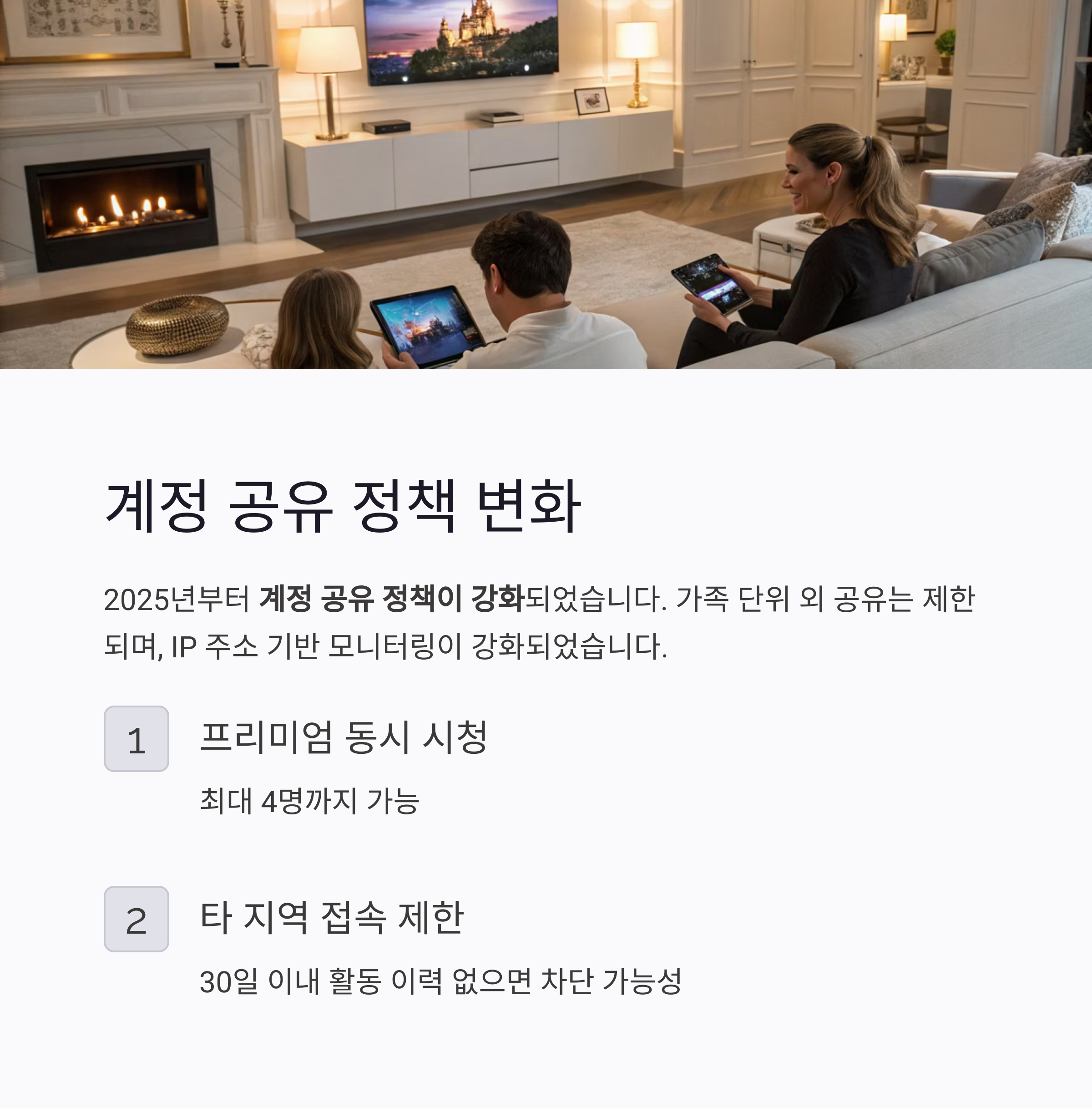 가족 단위 외 공유는 제한되며, IP 주소 기반 모니터링이 강화되었습니다.