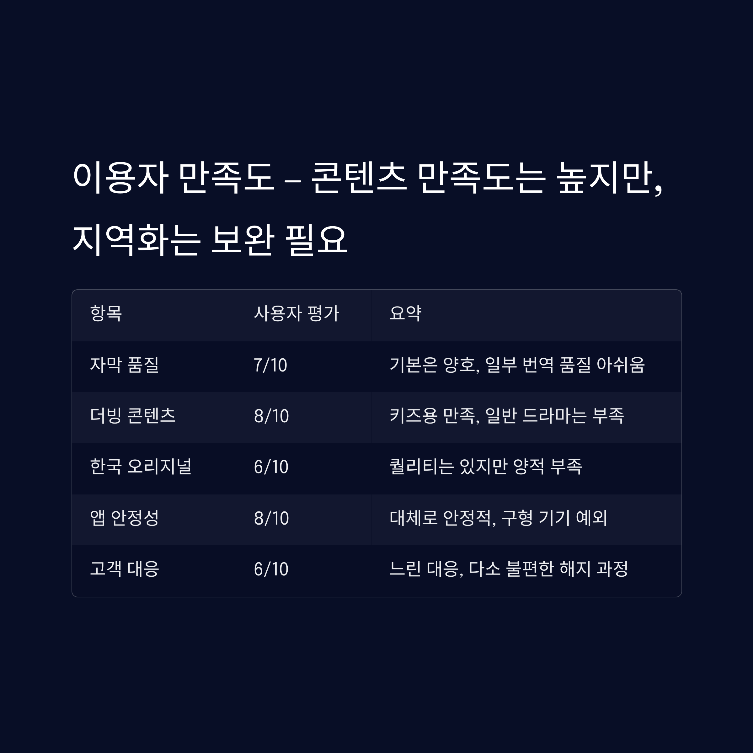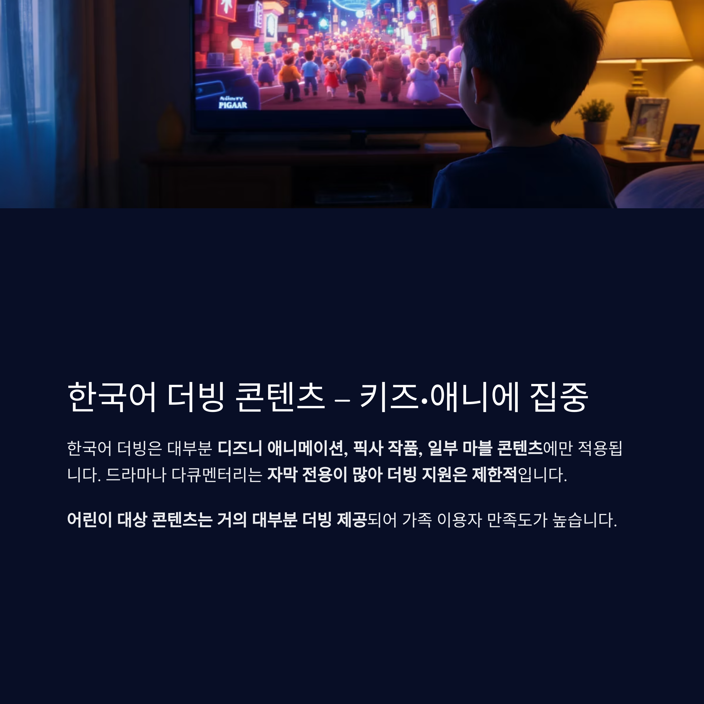 | 더빙 콘텐츠 | 8/10 – 키즈용 만족, 일반 드라마는 부족 |