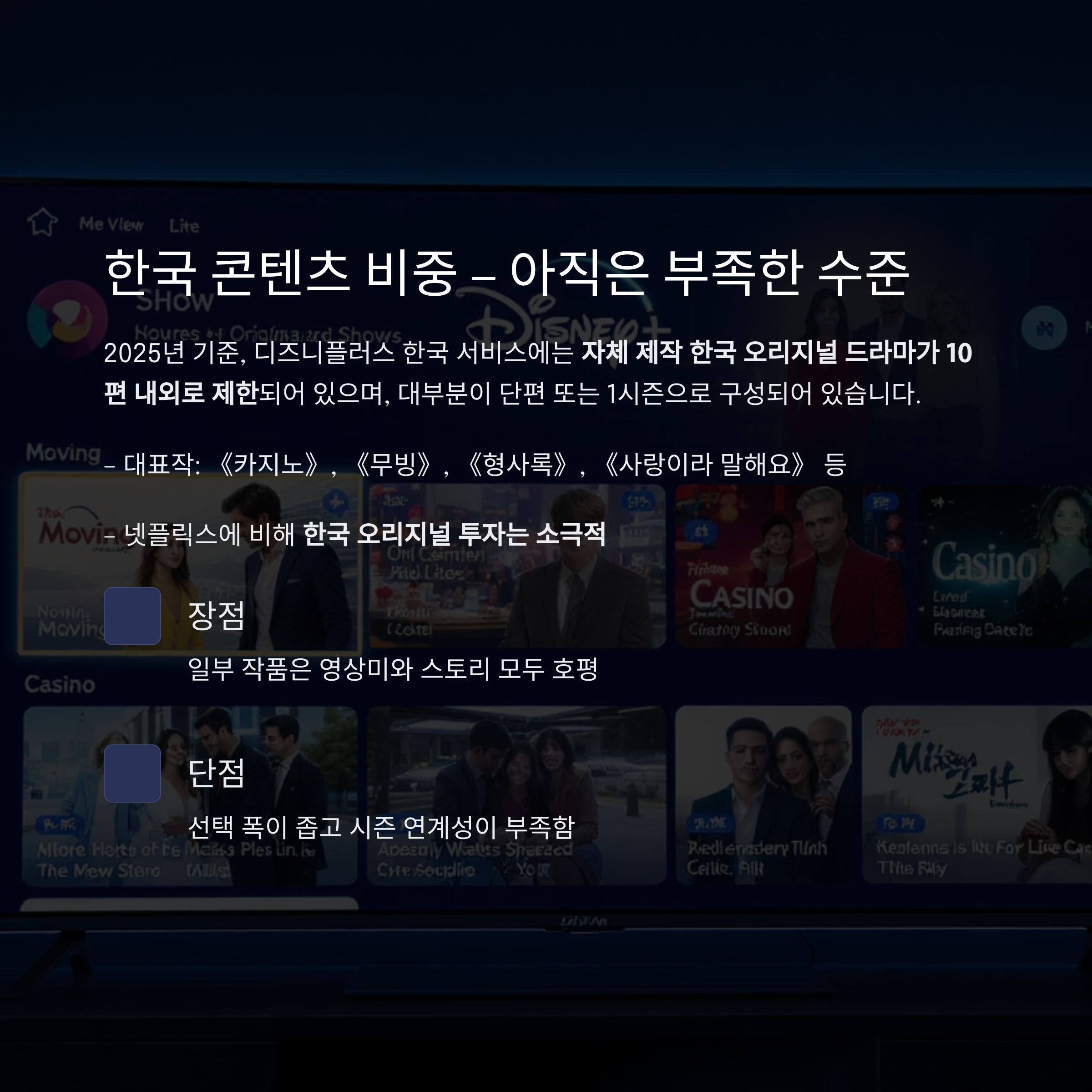 디즈니플러스의 한국 서비스는 글로벌 콘텐츠에 강점이 있는 반면,