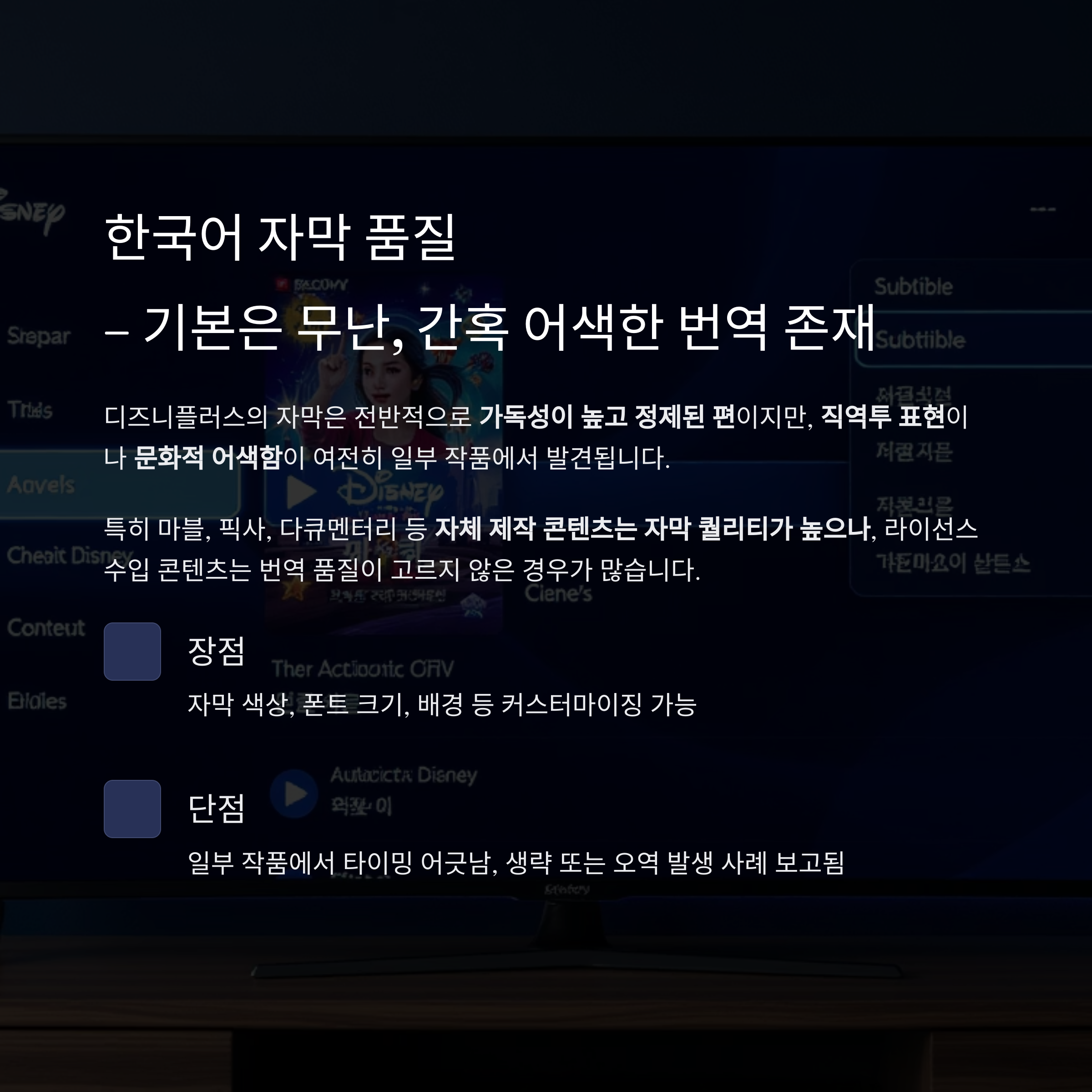 디즈니플러스의 자막은 전반적으로 가독성이 높고 정제된 편이지만,