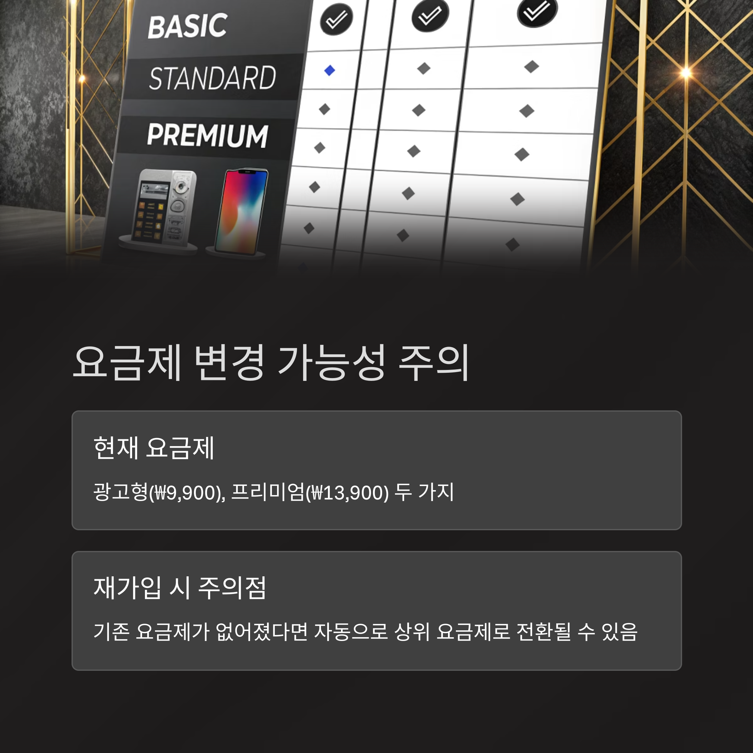 광고형(₩9,900), 프리미엄(₩13,900) 두 가지 요금제로 운영 중입니다.