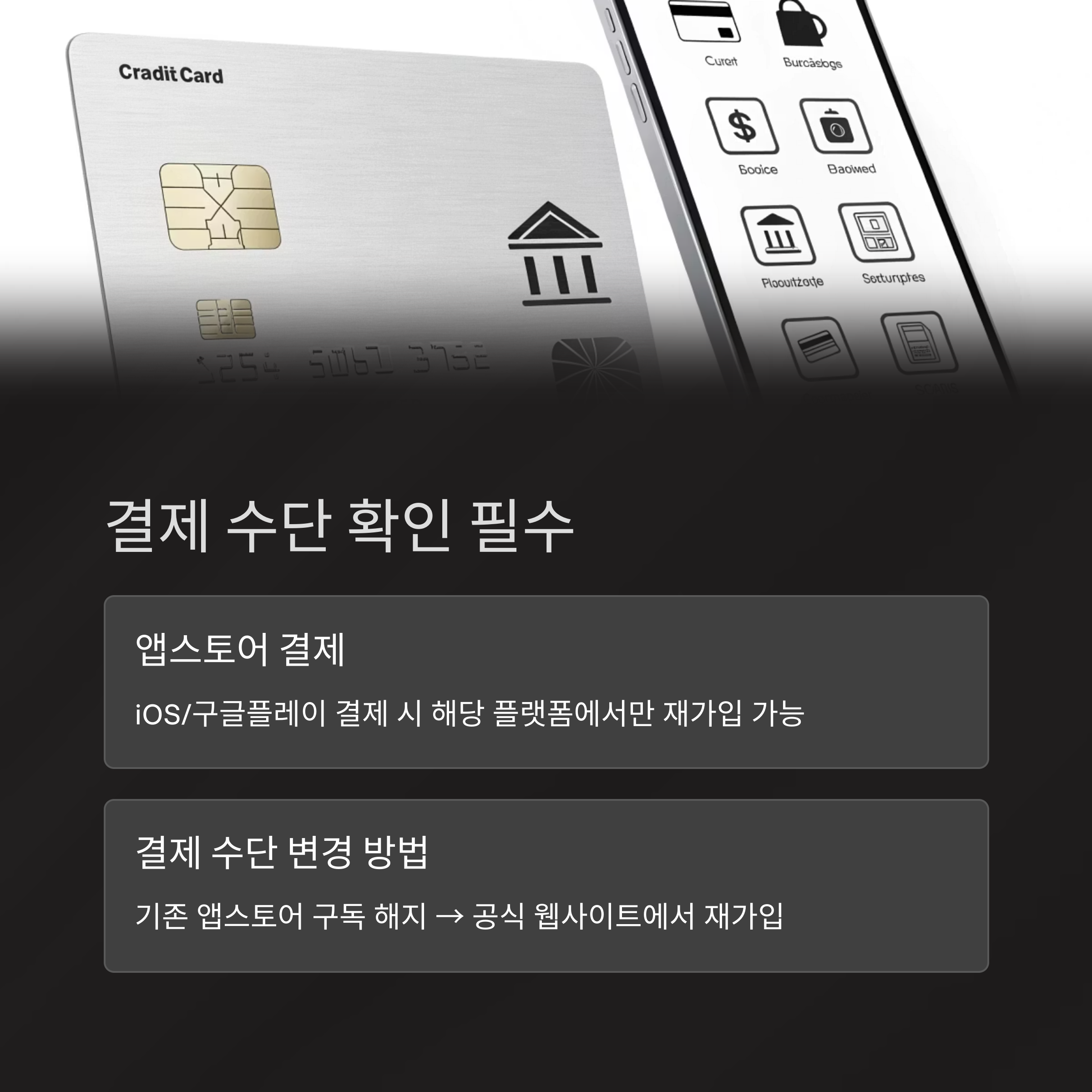 재가입은 해당 플랫폼에서만 가능하며, 웹에서 결제 변경이 제한될 수 있습니다.