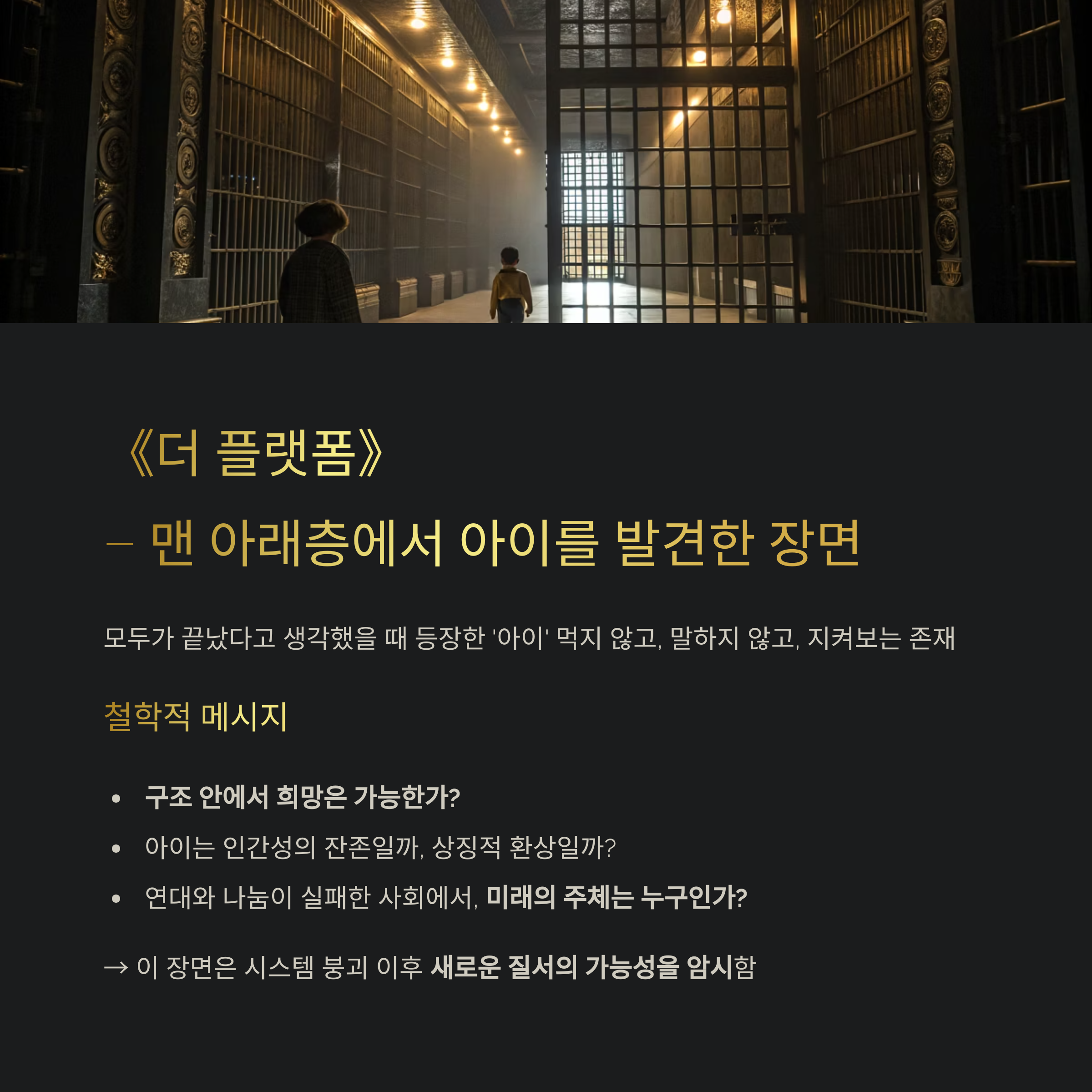 | 《더 플랫폼》 – 아이 발견 | 아래층의 침묵 속 존재하는 아이 | 인간성은 파괴되었는가, 미래는 존재하는가 |