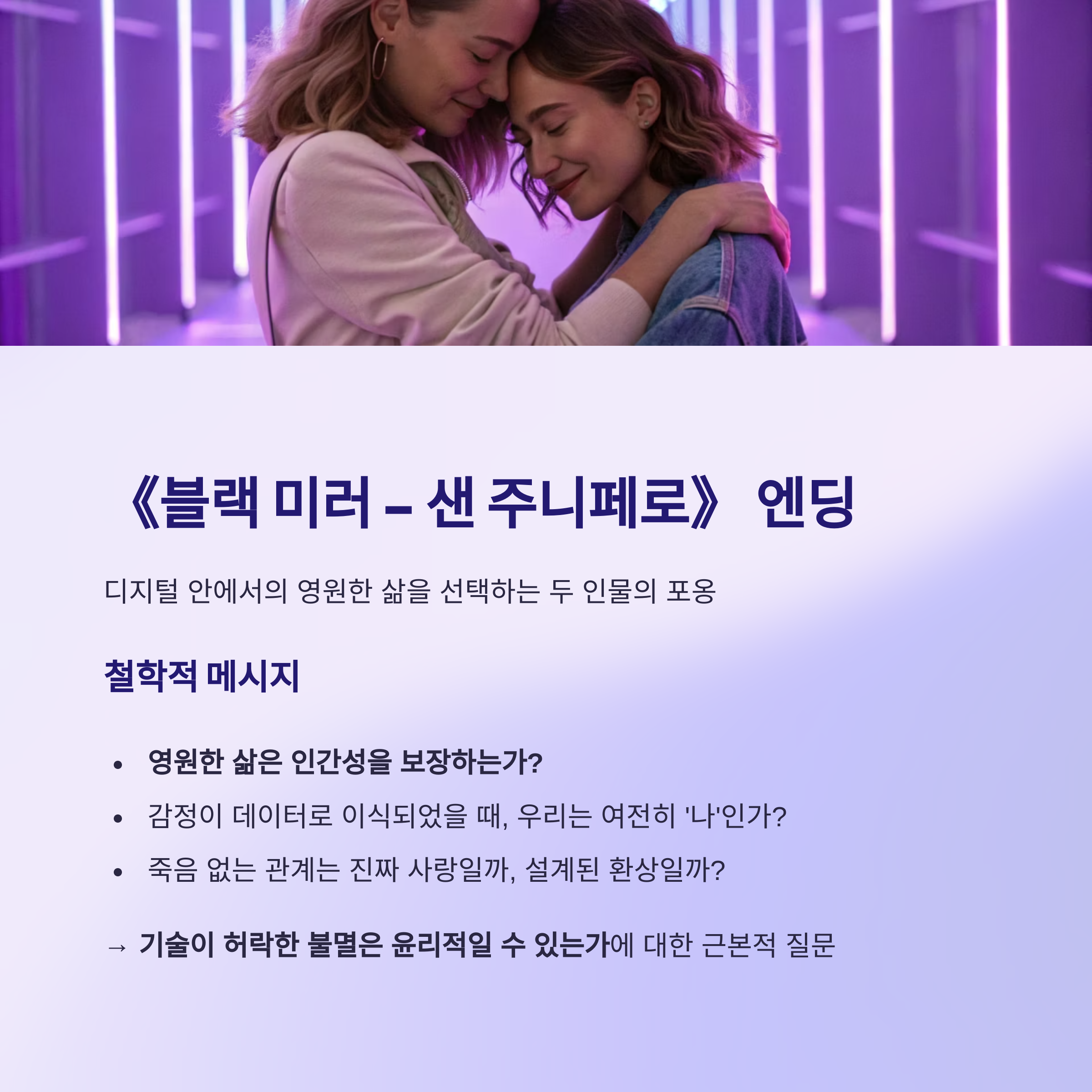 | 《샌 주니페로》 – 포옹 | 두 연인의 디지털 재회 | 영원한 삶은 진짜인가, 기술 속 감정은 진짜인가 |