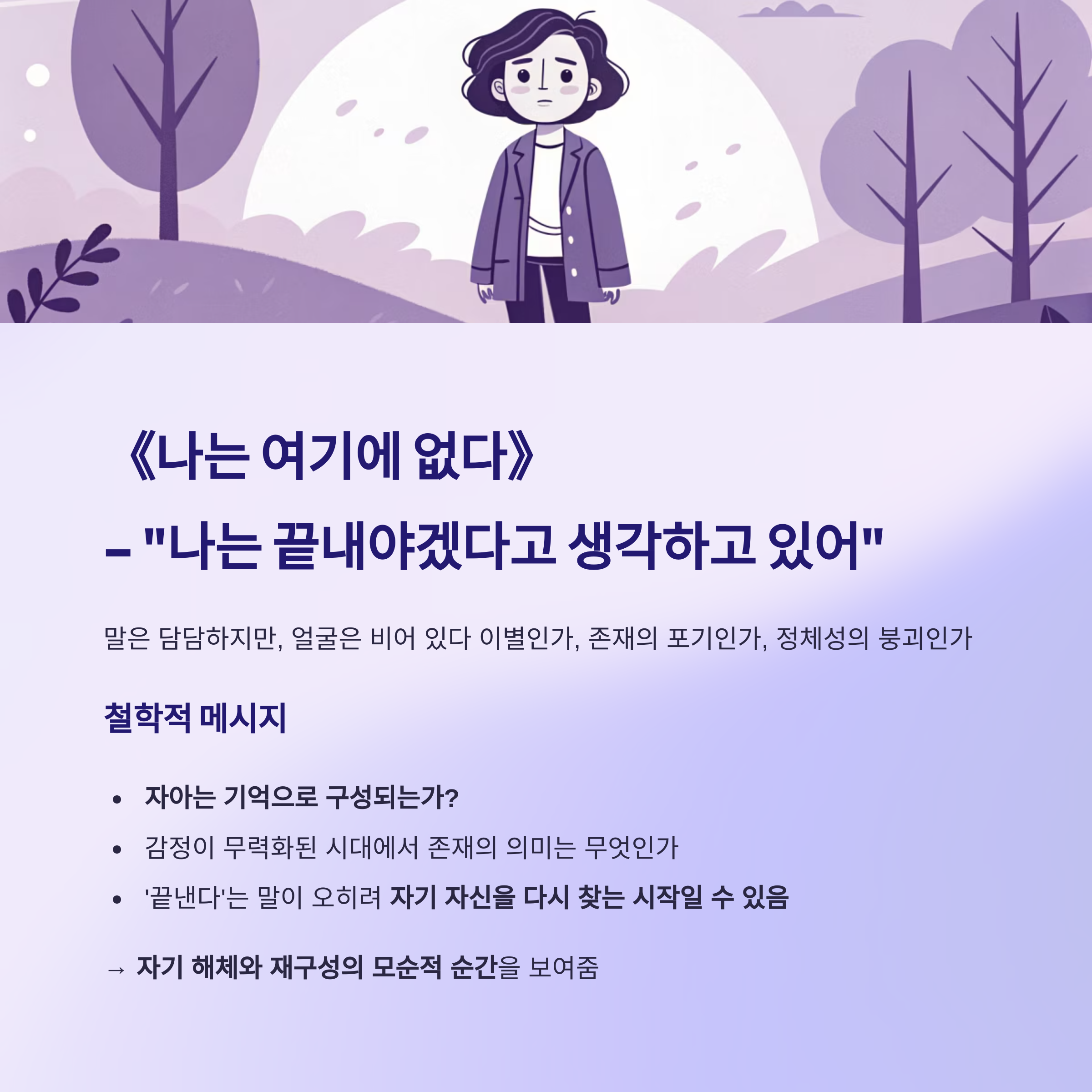 | 《나는 여기에 없다》 | “나는 끝내야겠어”라는 말과 공허한 표정 | 존재의 끝은 자아의 재정의인가, 감정은 의미를 증명할 수 있는가 |