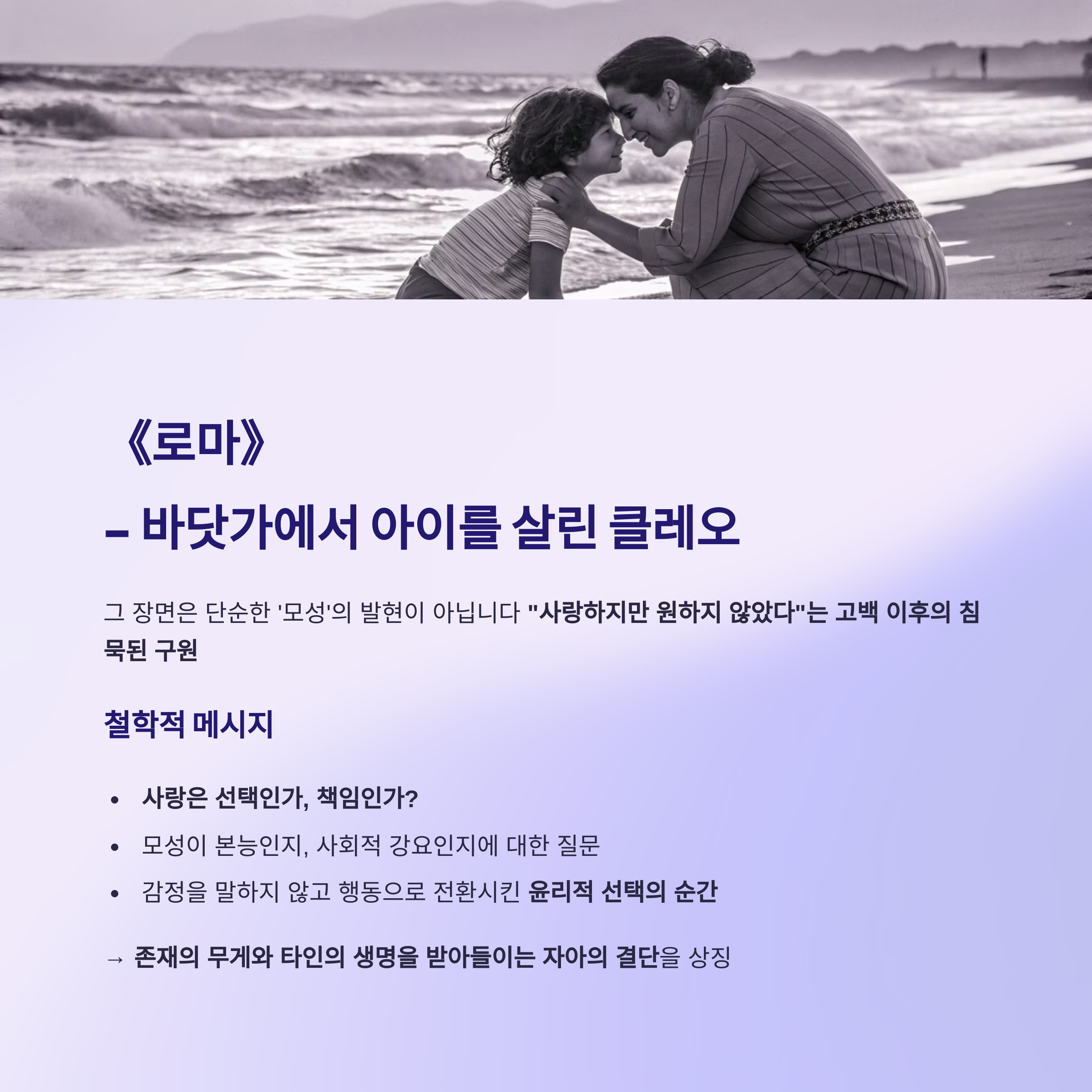 《로마》 – 바닷가 | 아이를 구한 뒤 울지 않는 클레오 | 사랑은 본능인가 책임인가, 존재 수용의 윤리란 무엇인가 |