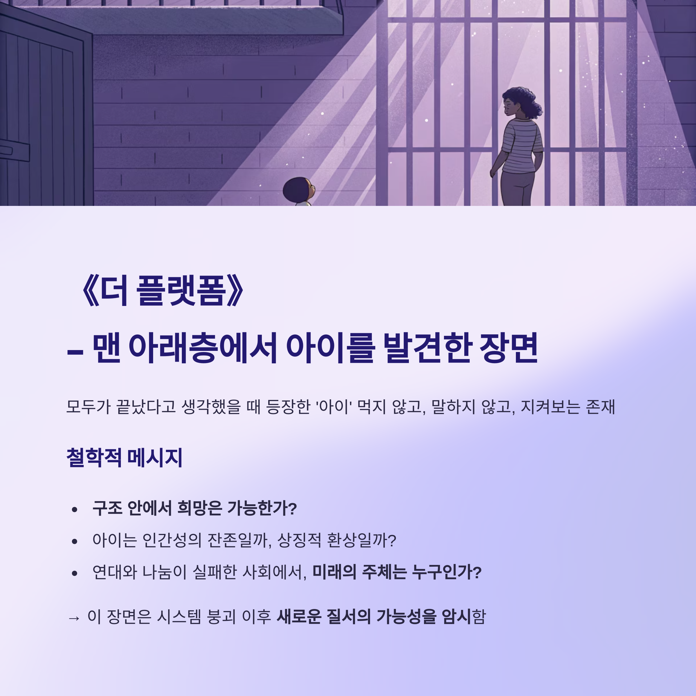 | 《더 플랫폼》 – 아이 발견 | 아래층의 침묵 속 존재하는 아이 | 인간성은 파괴되었는가, 미래는 존재하는가 |