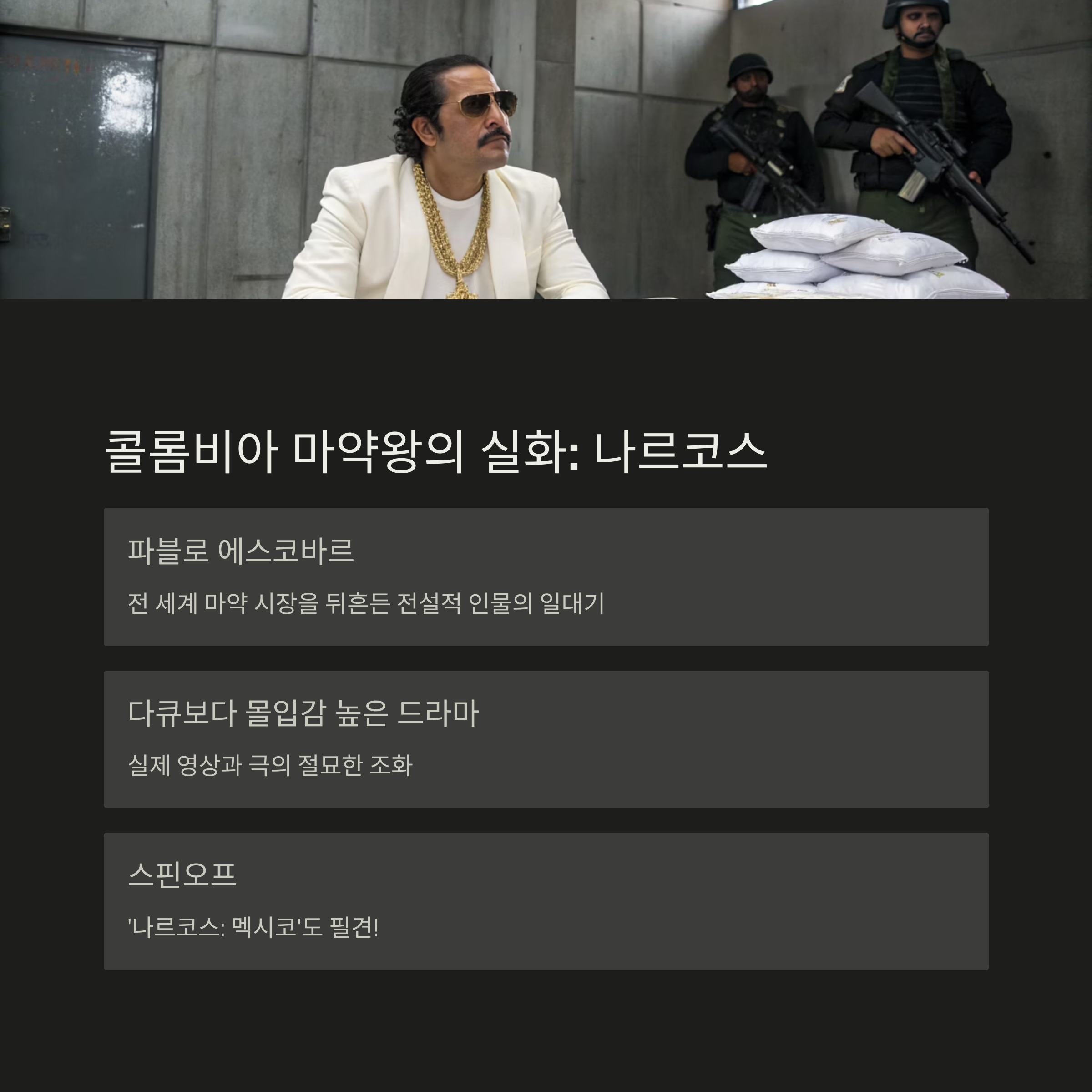 | 실화 기반 | 나르코스, 브레이킹 배드 | 현실성 강한 서사 |