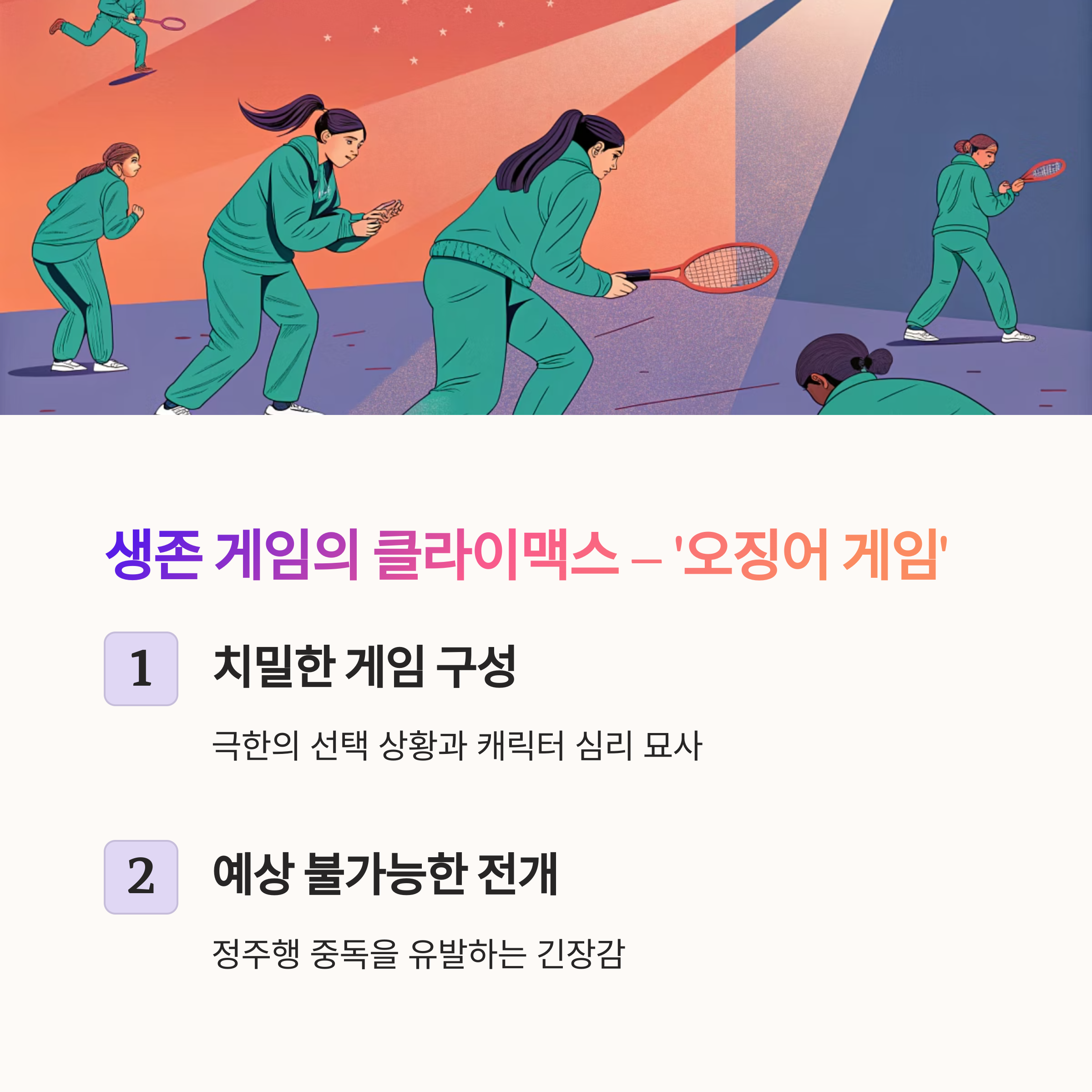 | 오징어 게임 | 생존 스릴러 | 게임 구조, 인간 본성, 반전 연출 |