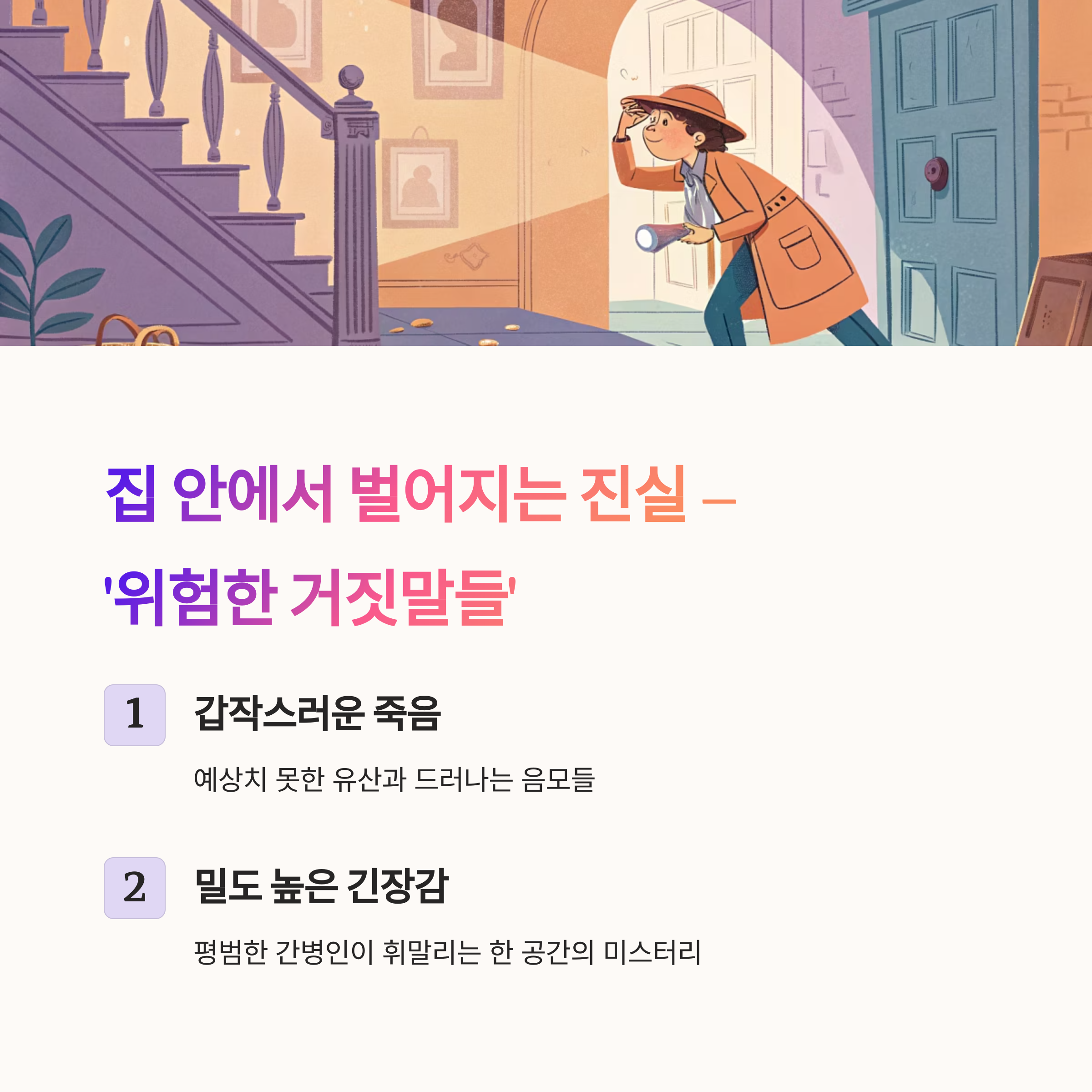 | 위험한 거짓말들 | 일상 미스터리 | 밀폐 공간 스릴, 현실적 긴장감 |