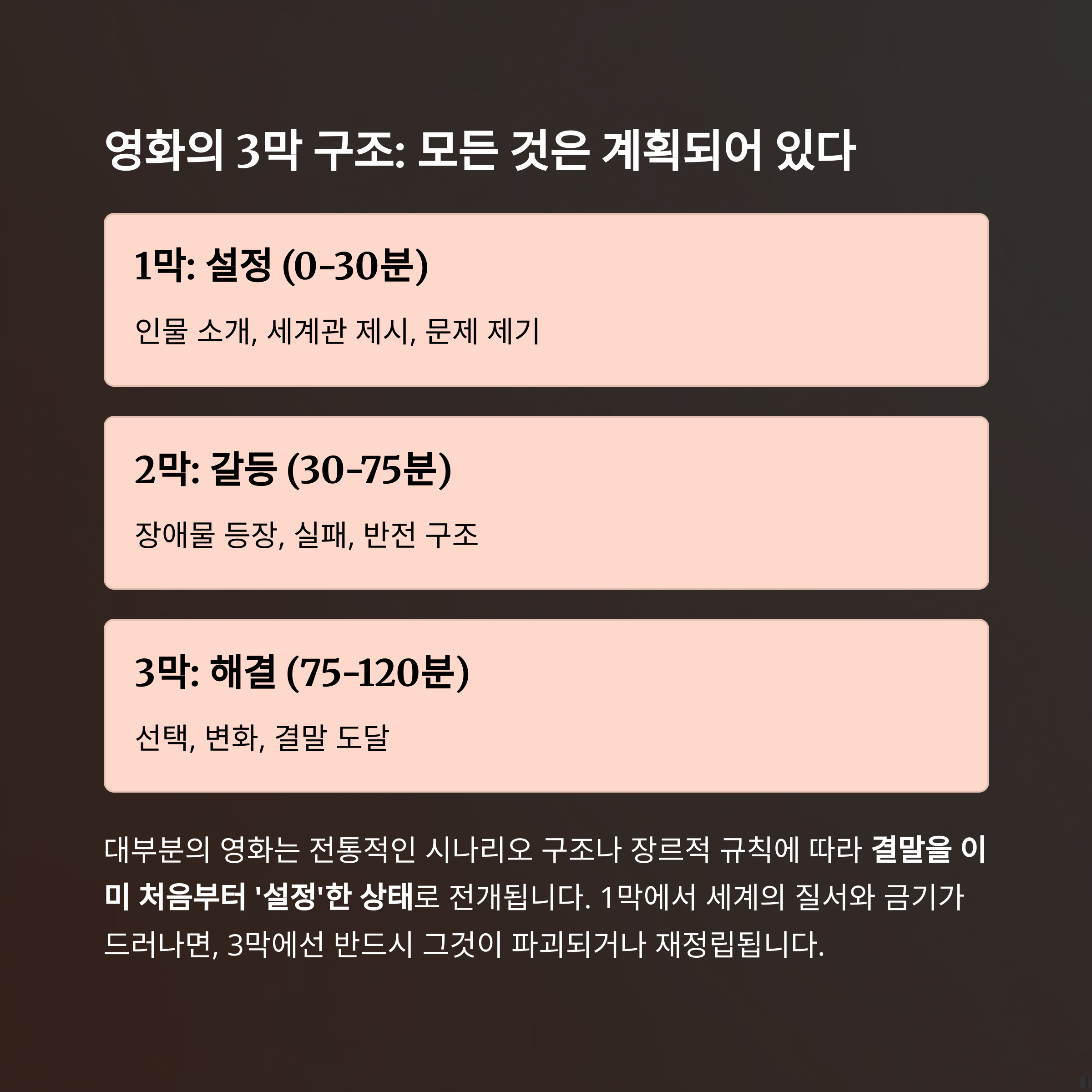 ① 시나리오 3막 구조: 서막 – 대립 – 전환