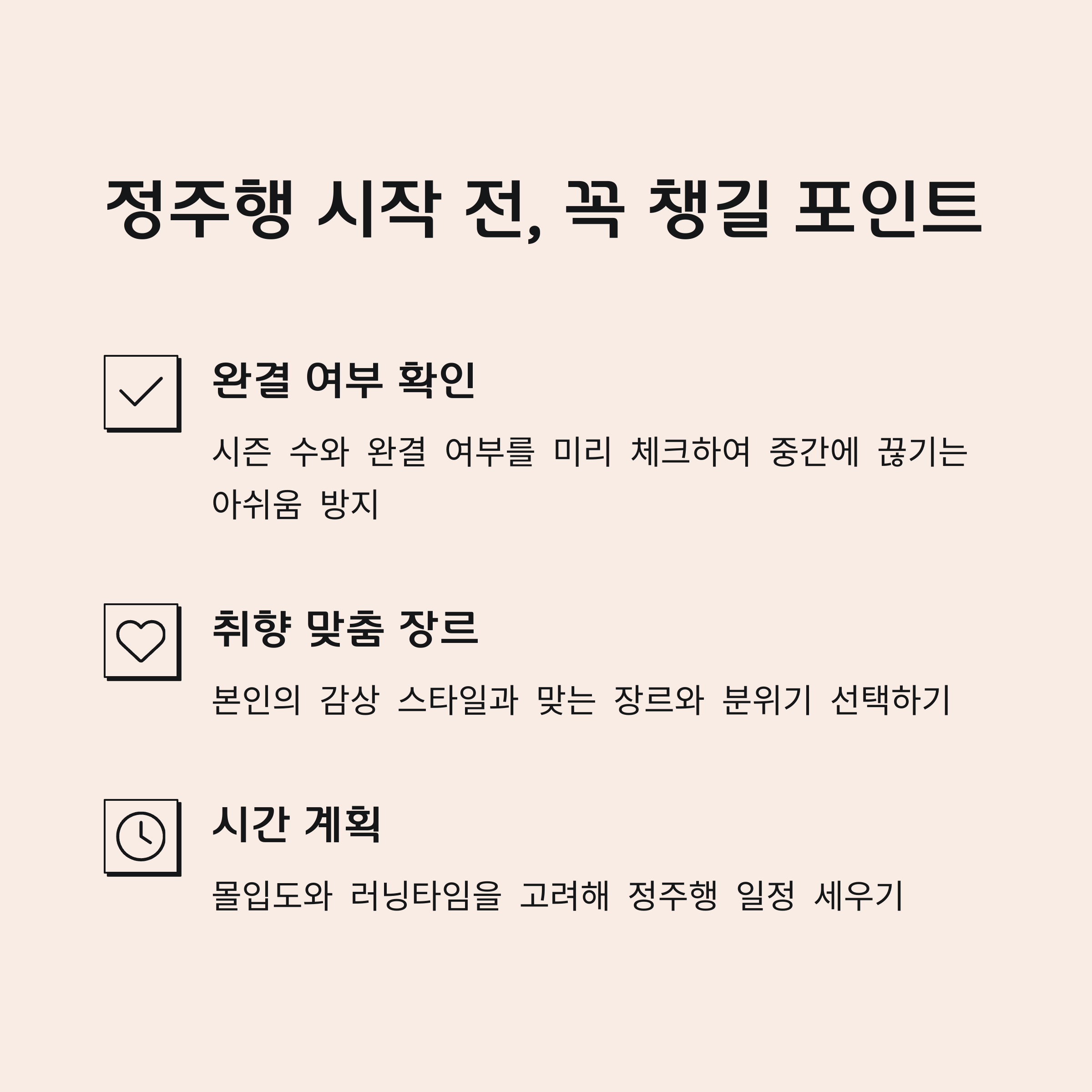 "좋은 정주행 작품은 몰입감, 에피소드 퀄리티, 연결성 세 가지를 갖춰야 합니다"