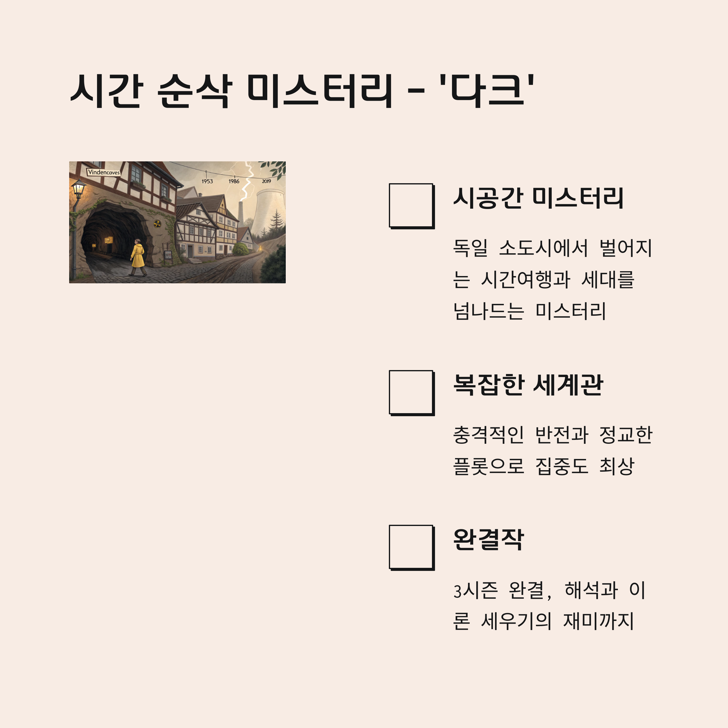 '다크' 는 복잡한 시간여행과 인물들의 운명을 치밀하게 얽어낸 미스터리 시리즈입니다